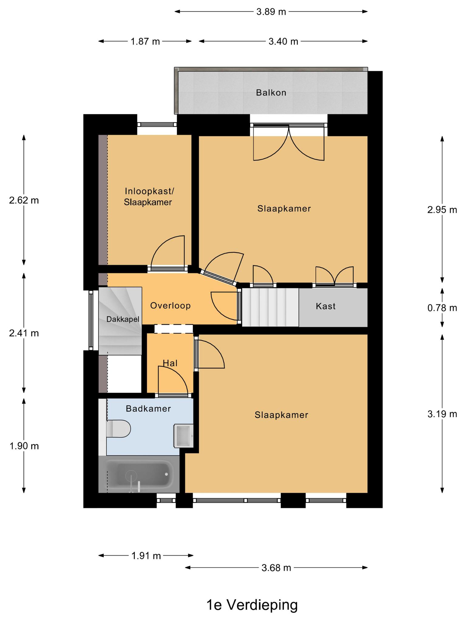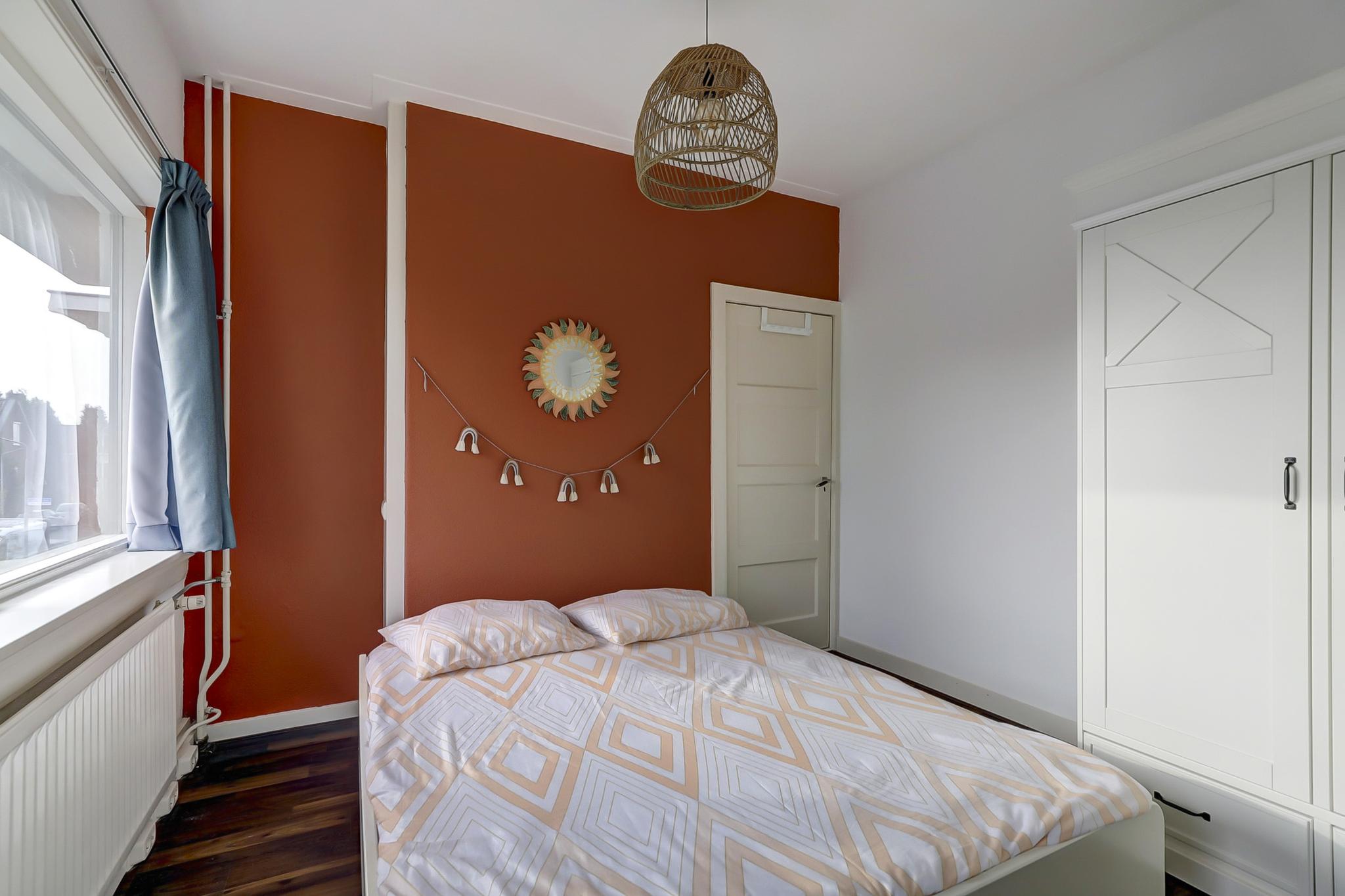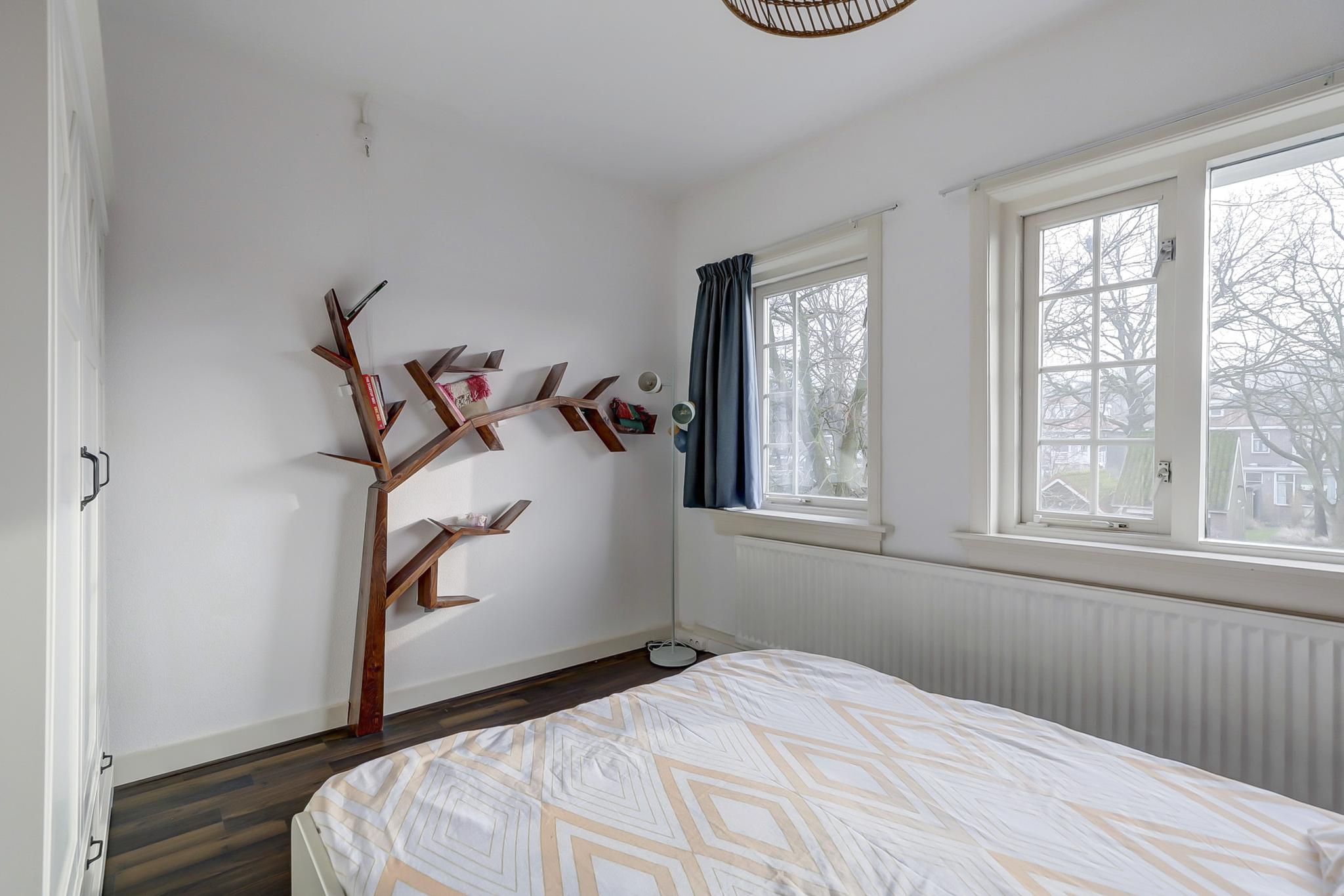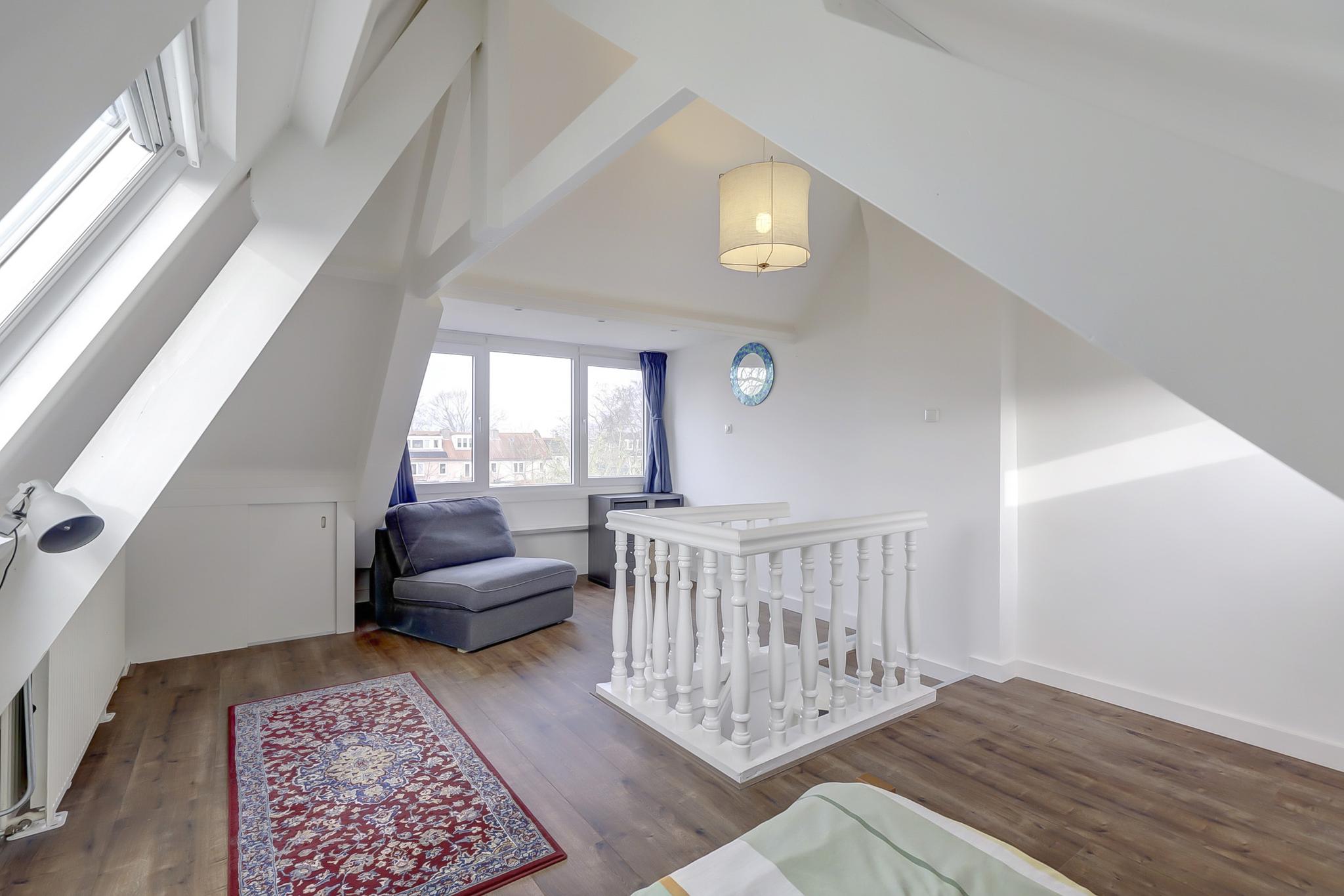 Eerste verdieping: overloop, in totaal zijn er drie slaapkamers, waarbij de kleinste slaapkamer nu in gebruik is als kledingkamer. Vanuit de grote slaapkamer aan de achterzijde kom je op een balkon uit. De moderne badkamer is voorzien van een ligbad/douche, wc en wastafelmeubel.