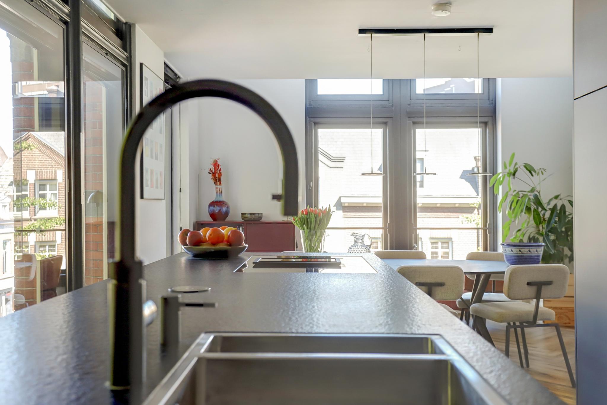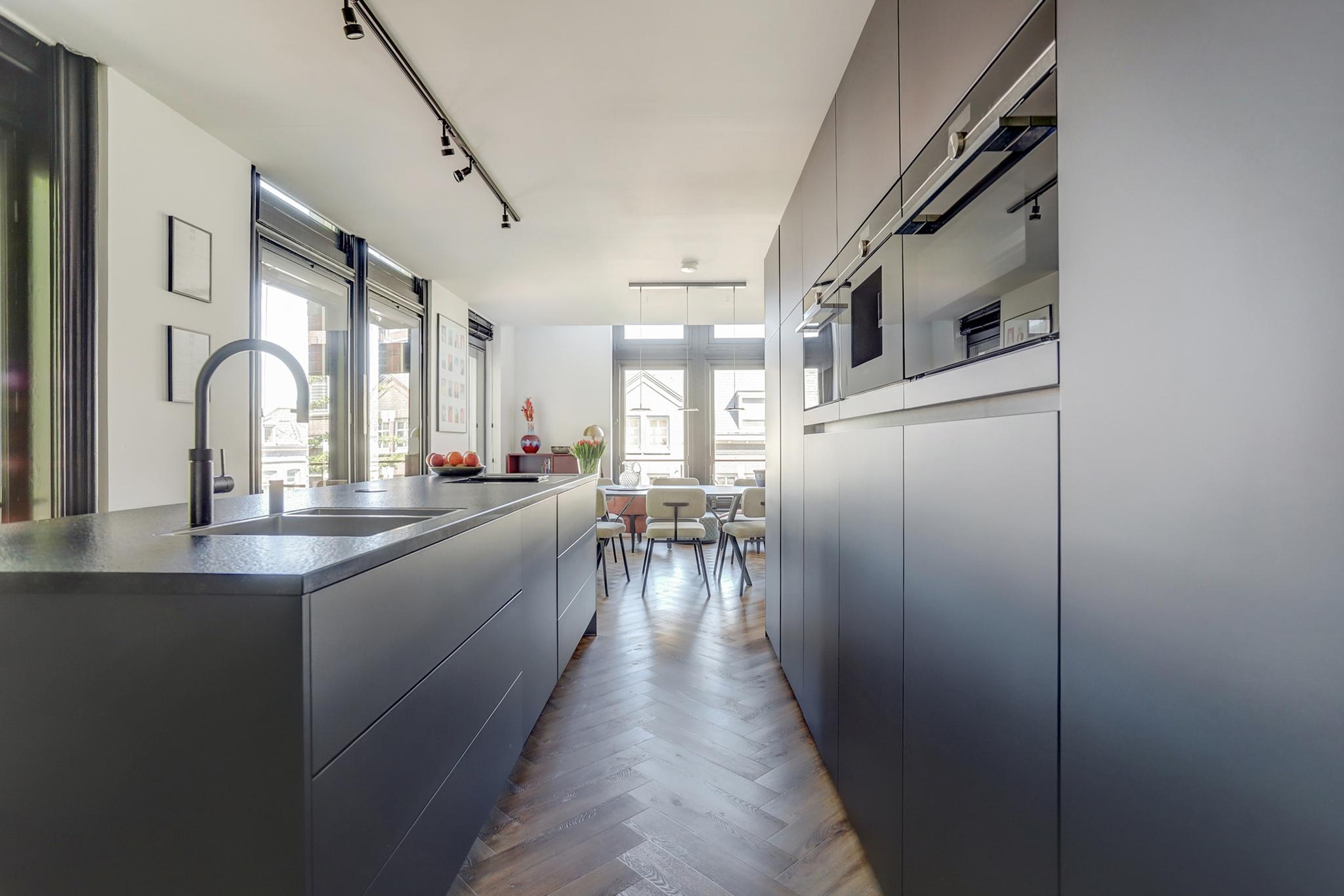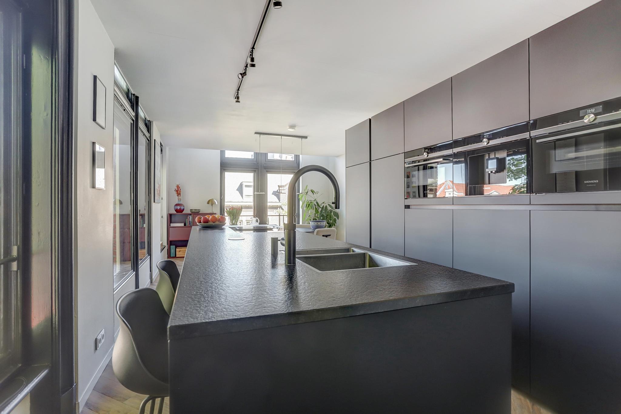 Eerste verdieping: voordeur, tochtportaal, gang met toilet, meterkast en bergruimte met garderoberuimte. De woonkeuken die dan volgt is opgebouwd uit een zeer luxe en complete inrichting. Zo'n beetje alle denkbare apparaten zijn aangevinkt tijdens het samenstellen van de keuken. Zo tref je er de high-end Siemens StudioLine BlackSteel serie aan (stoomoven, combi-magnetron, koffiemachine), een vriezer, 2 koelkasten, Quooker, vaatwasser en een inductiekookplaat met geïntegreerde afzuigunit. Centraal in de ruimte staat het kook- en spoeleiland dat is voorzien van een hardstenen blad met geïntegreerde stopcontactmodule, terwijl de apparaten zich voornamelijk aan de lange keukenwand bevinden. Op de vloer ligt een pvc vloer, in visgraatmotief, met vloerverwarming. Naast de keuken is er meer dan voldoende ruimte voor een royale eettafel van waar je fraai wegkijkt over de kruising en de winkelstraten.