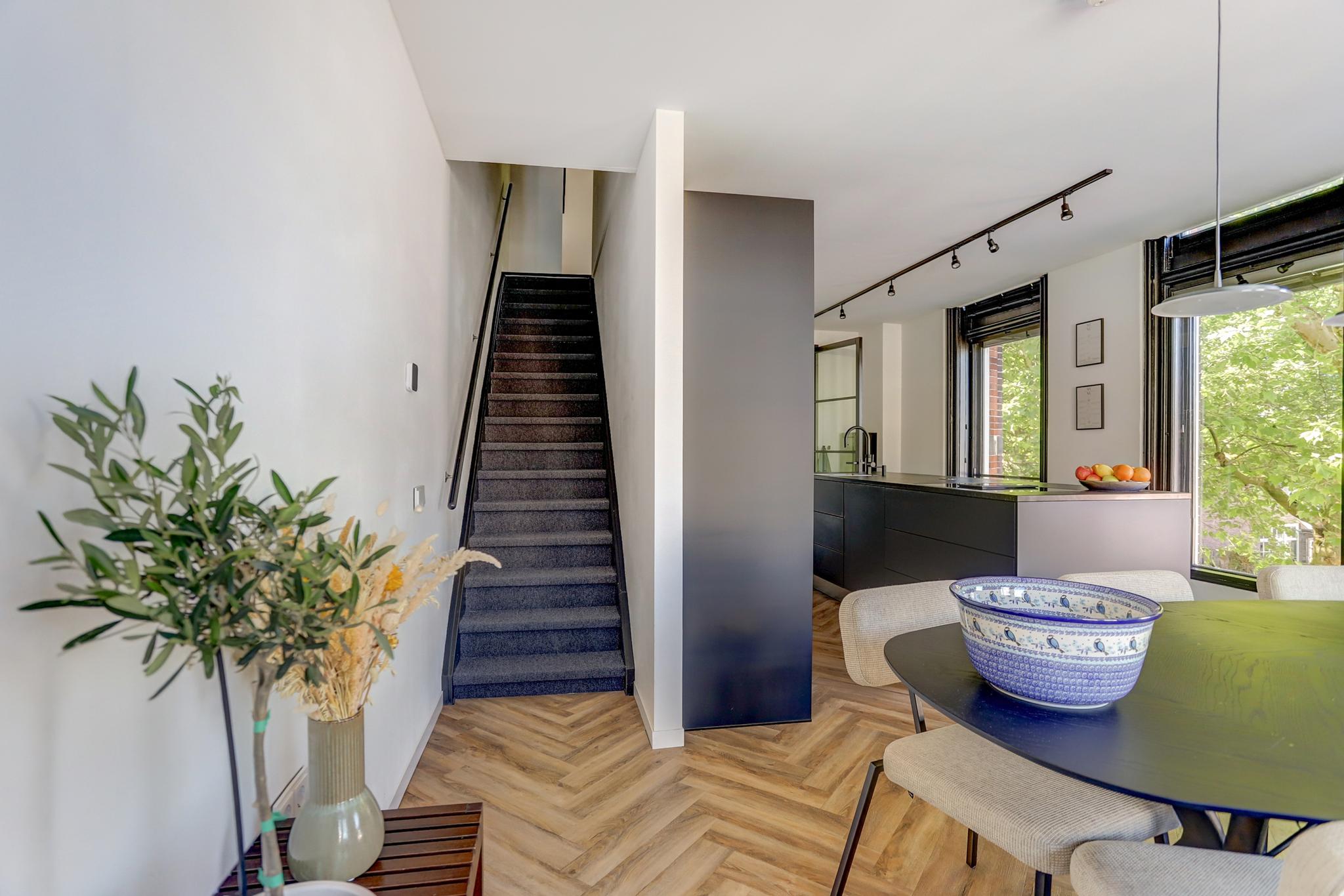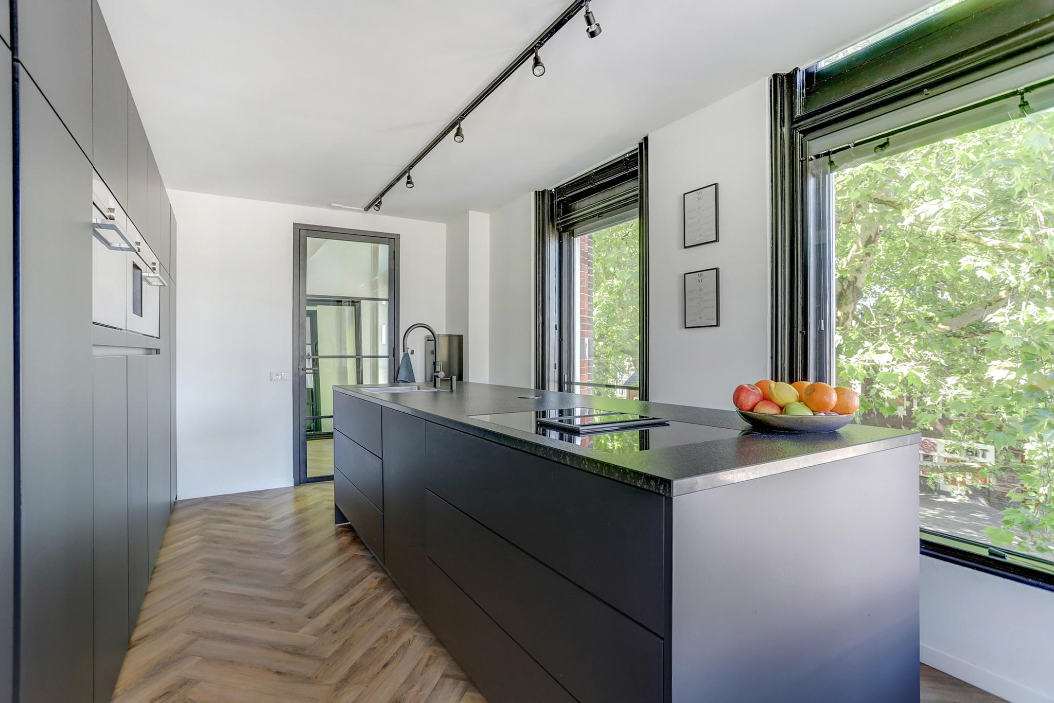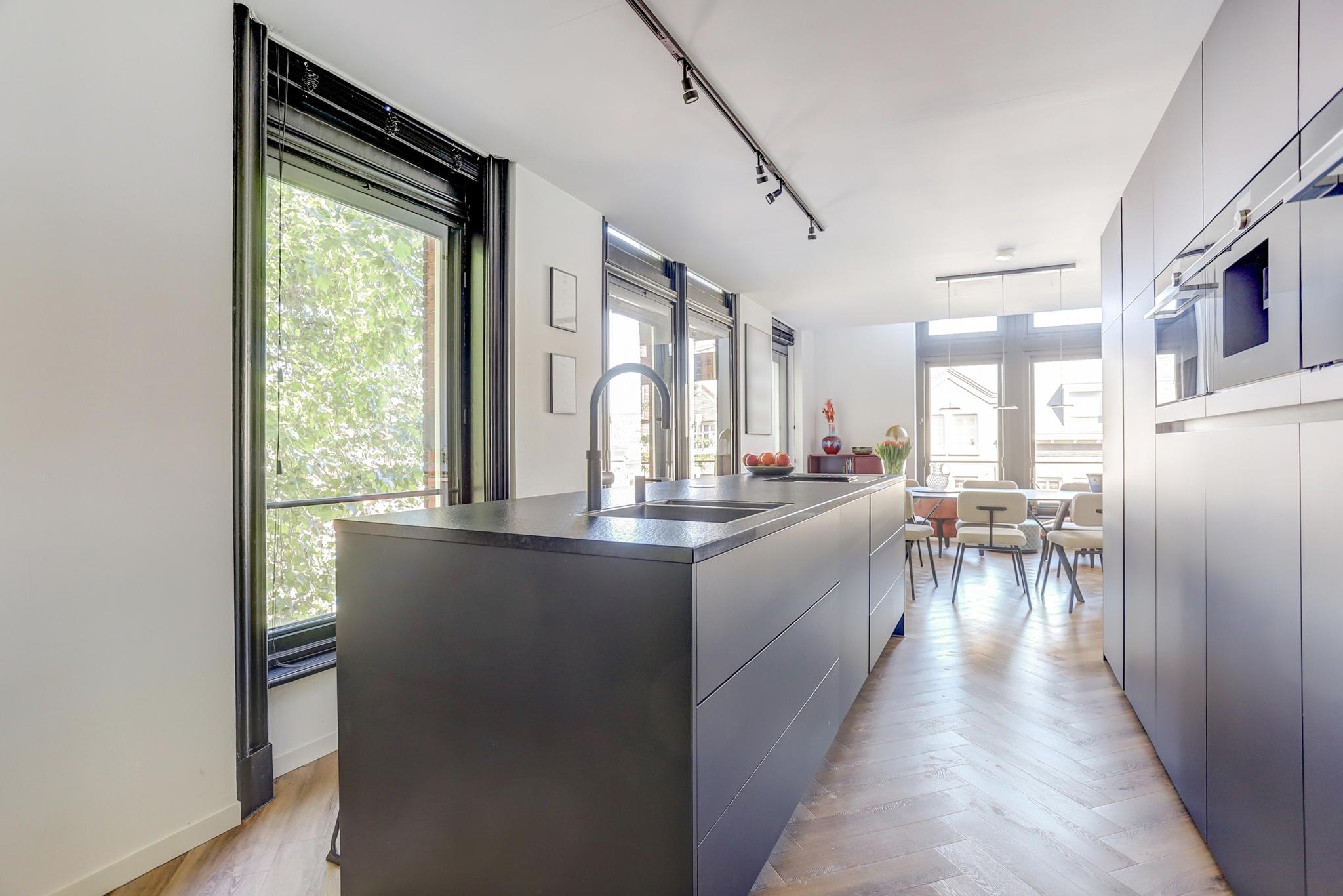 Eerste verdieping: voordeur, tochtportaal, gang met toilet, meterkast en bergruimte met garderoberuimte. De woonkeuken die dan volgt is opgebouwd uit een zeer luxe en complete inrichting. Zo'n beetje alle denkbare apparaten zijn aangevinkt tijdens het samenstellen van de keuken. Zo tref je er de high-end Siemens StudioLine BlackSteel serie aan (stoomoven, combi-magnetron, koffiemachine), een vriezer, 2 koelkasten, Quooker, vaatwasser en een inductiekookplaat met geïntegreerde afzuigunit. Centraal in de ruimte staat het kook- en spoeleiland dat is voorzien van een hardstenen blad met geïntegreerde stopcontactmodule, terwijl de apparaten zich voornamelijk aan de lange keukenwand bevinden. Op de vloer ligt een pvc vloer, in visgraatmotief, met vloerverwarming. Naast de keuken is er meer dan voldoende ruimte voor een royale eettafel van waar je fraai wegkijkt over de kruising en de winkelstraten.