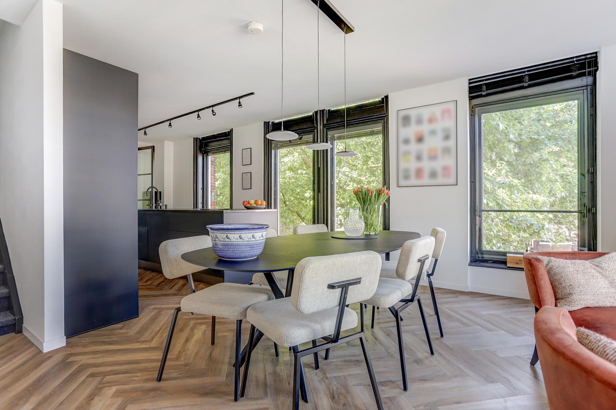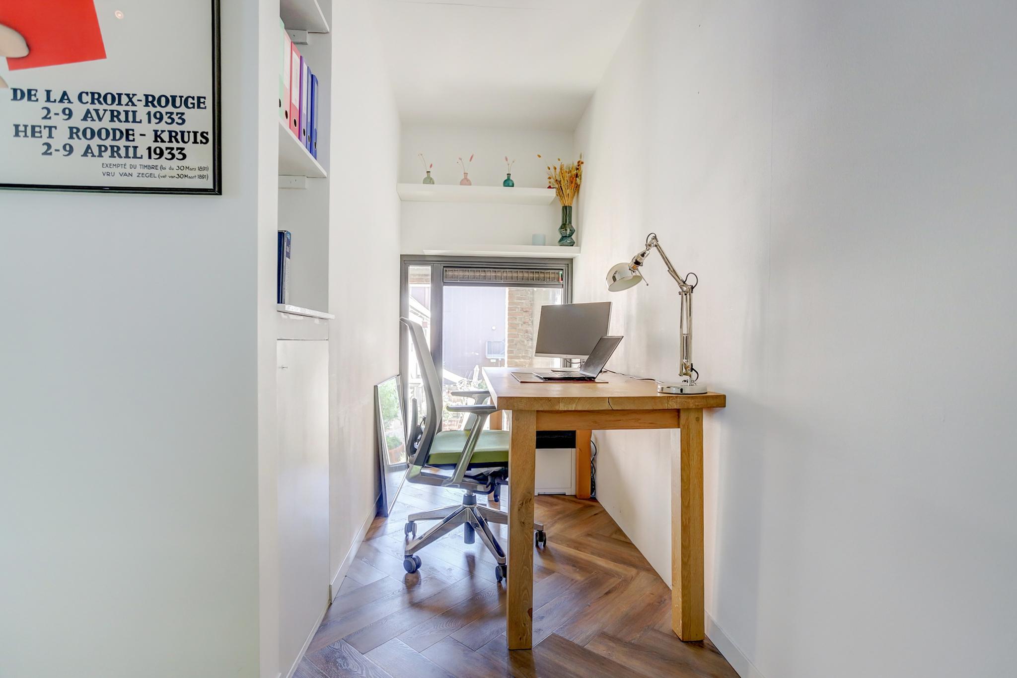 Tweede verdieping: mooie open woonkamer met wederom een fantastisch uitzicht. Doordat er vides gemaakt zijn en de ramen vanaf de eerste verdieping deels doorlopen naar de tweede verdieping is er een uniek perspectief ontstaan wat men zelden in een woning terug ziet. In de woonkamer is een werkplek gecreëerd. Desgewenst is deze dusdanig te verbouwen met een scheidingswand dat er een aparte kamer ontstaat. Ook hier ligt een pvc visgraatvloer met vloerverwarming.