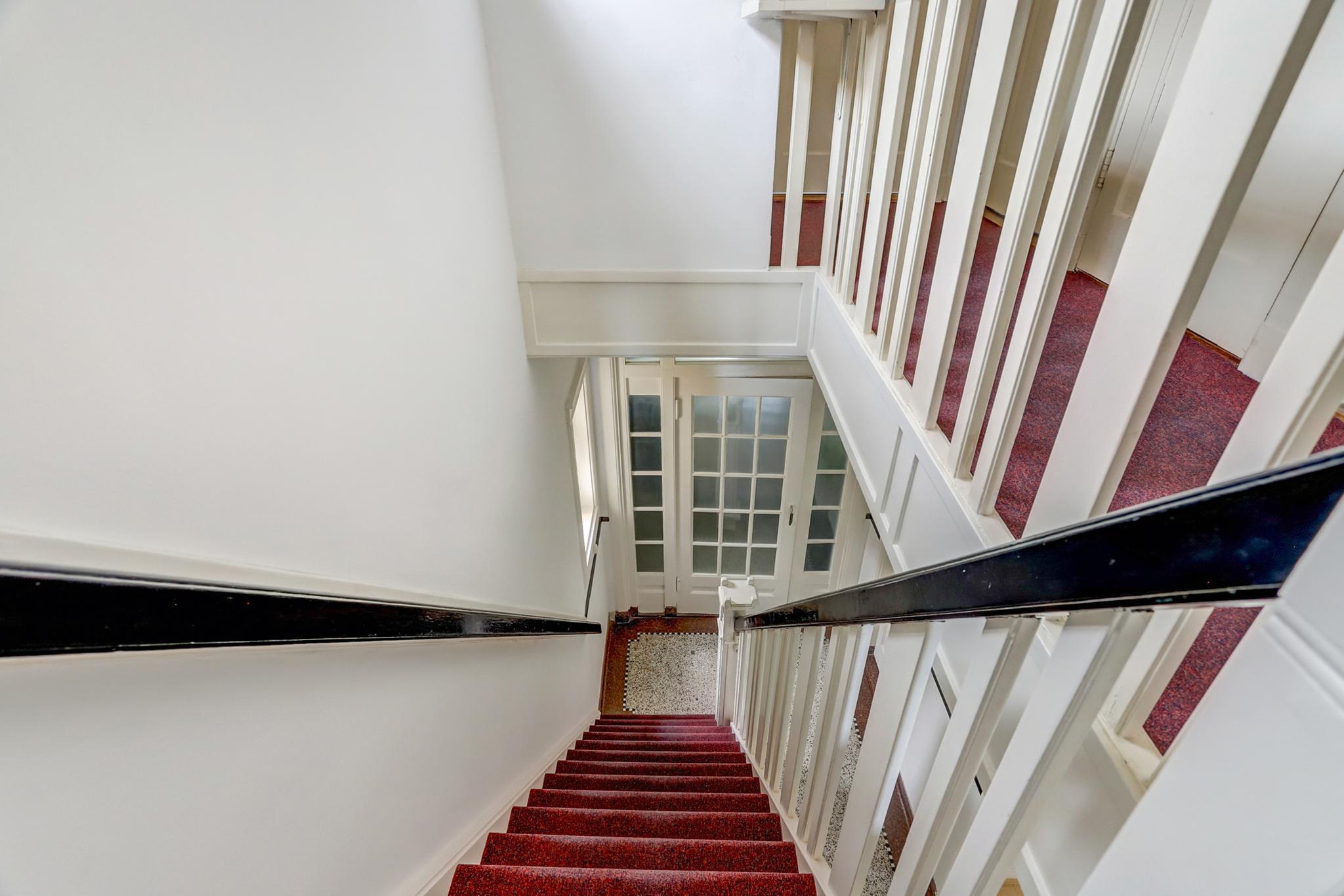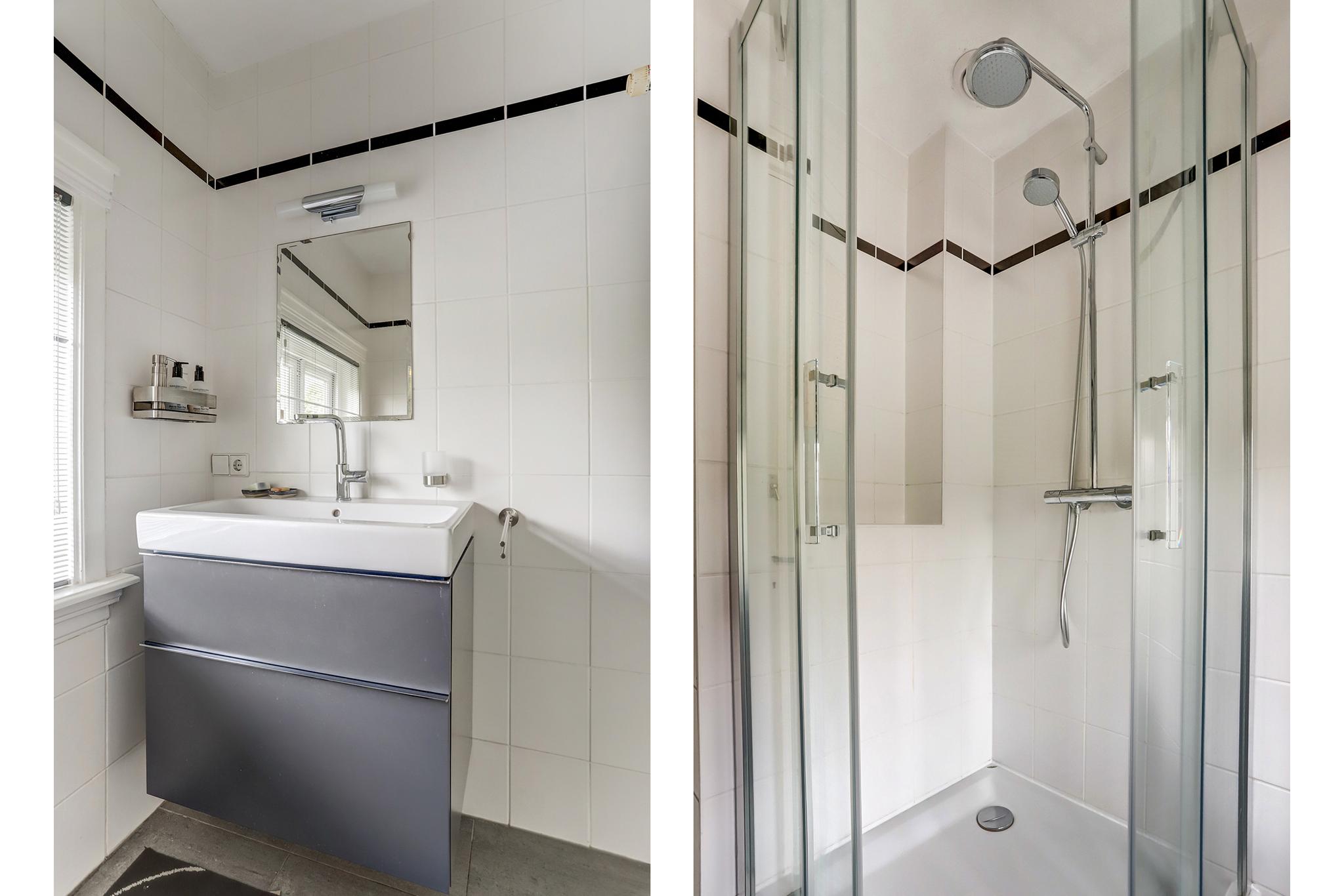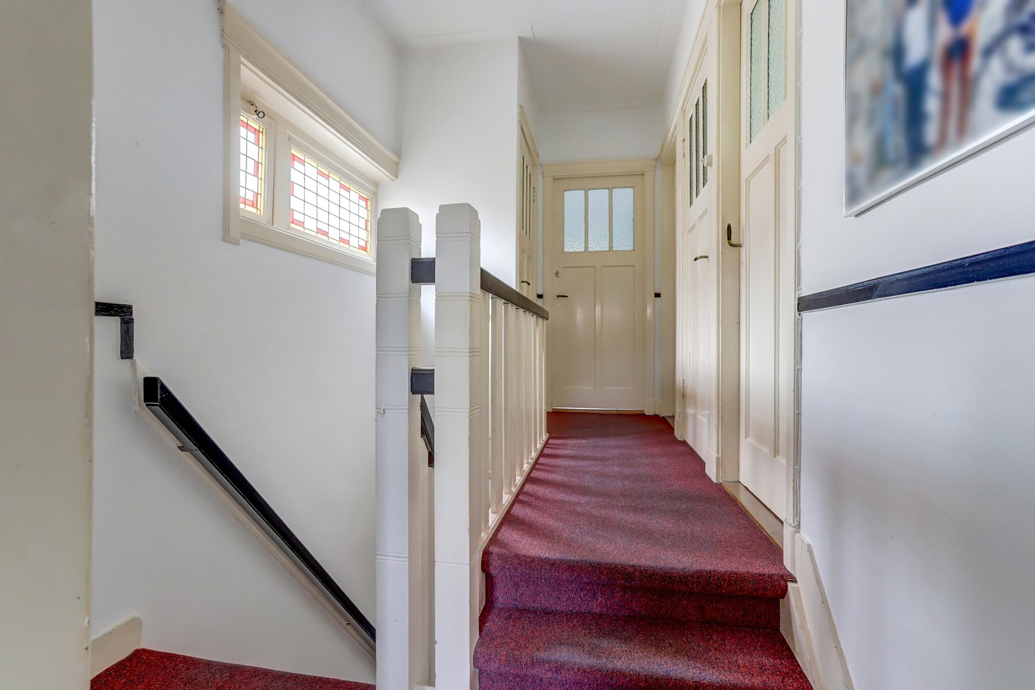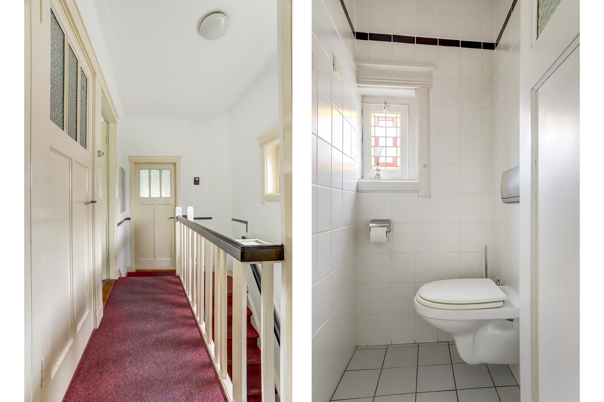 Eerste verdieping: het prachtige trappenhuis biedt toegang tot de overloop, 3 slaapkamers waarvan 2 met een vaste kast en 1 met een balkon aan de achterzijde, separaat toilet en de badkamer. De keurige badkamer heeft een douche, wastafelmeubel en een designradiator.