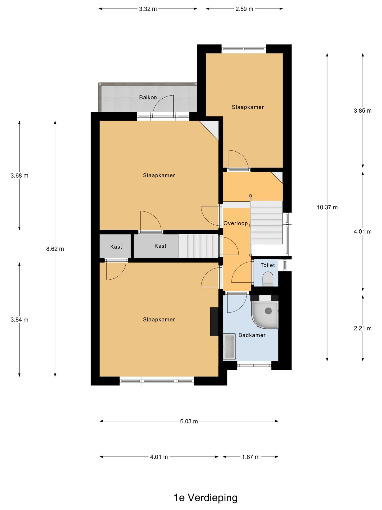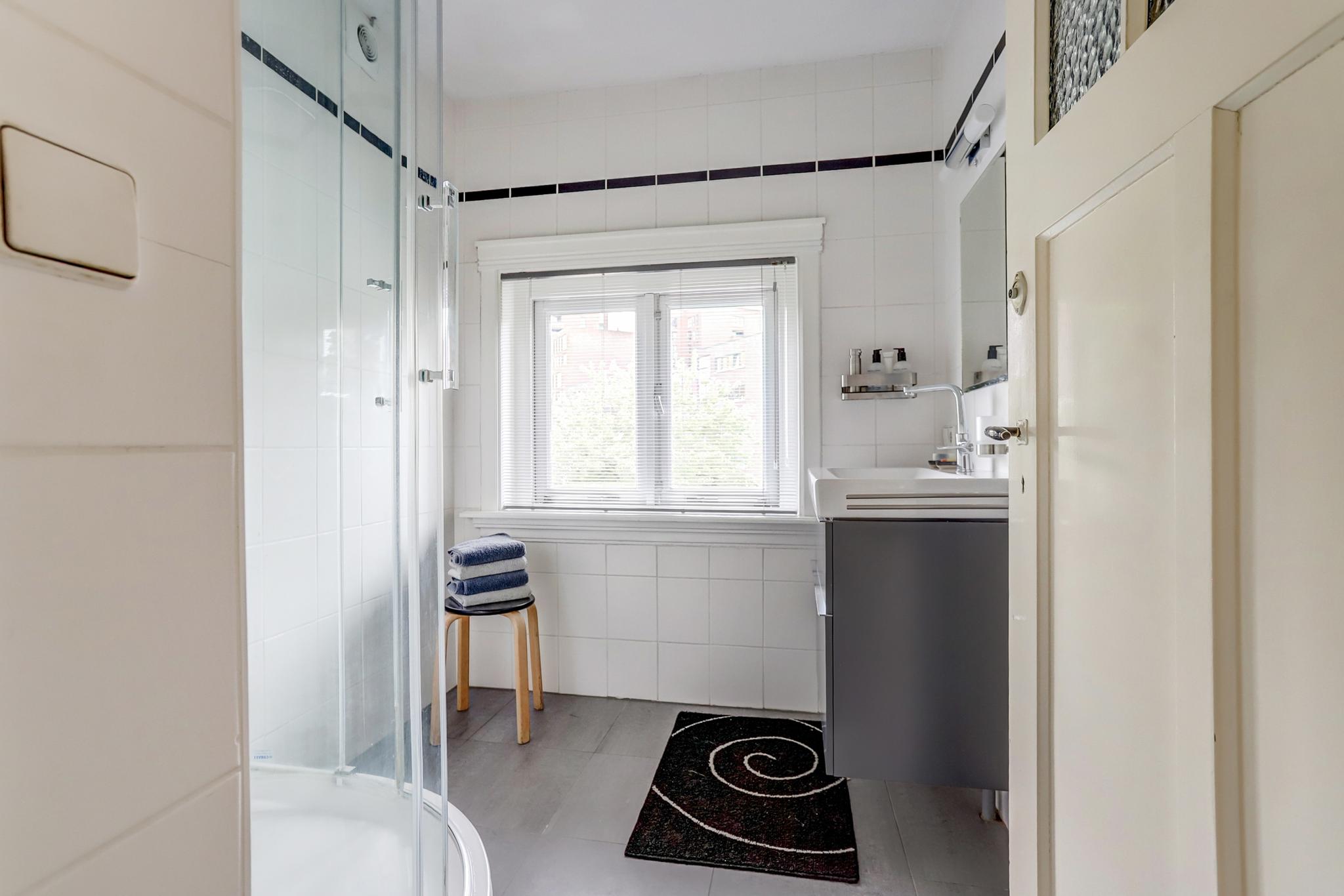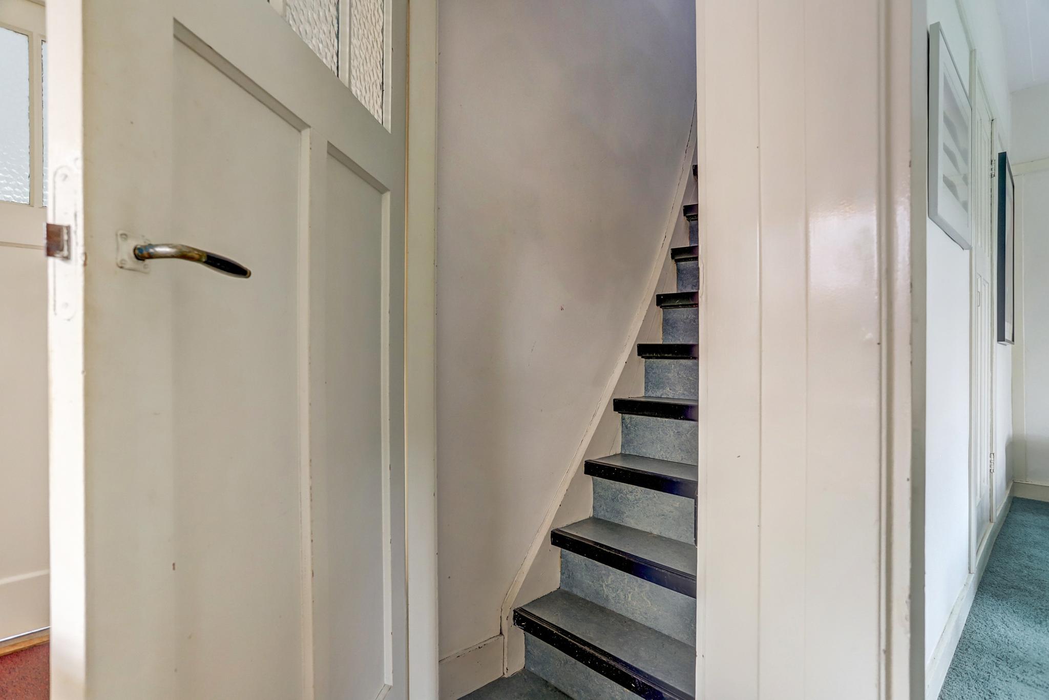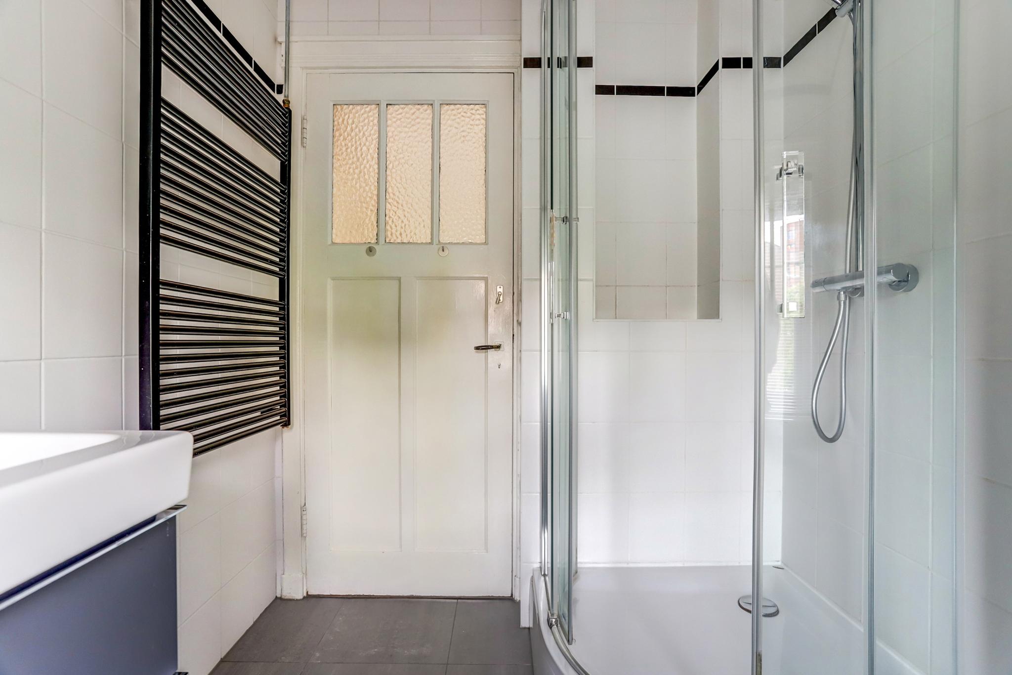 Eerste verdieping: het prachtige trappenhuis biedt toegang tot de overloop, 3 slaapkamers waarvan 2 met een vaste kast en 1 met een balkon aan de achterzijde, separaat toilet en de badkamer. De keurige badkamer heeft een douche, wastafelmeubel en een designradiator.