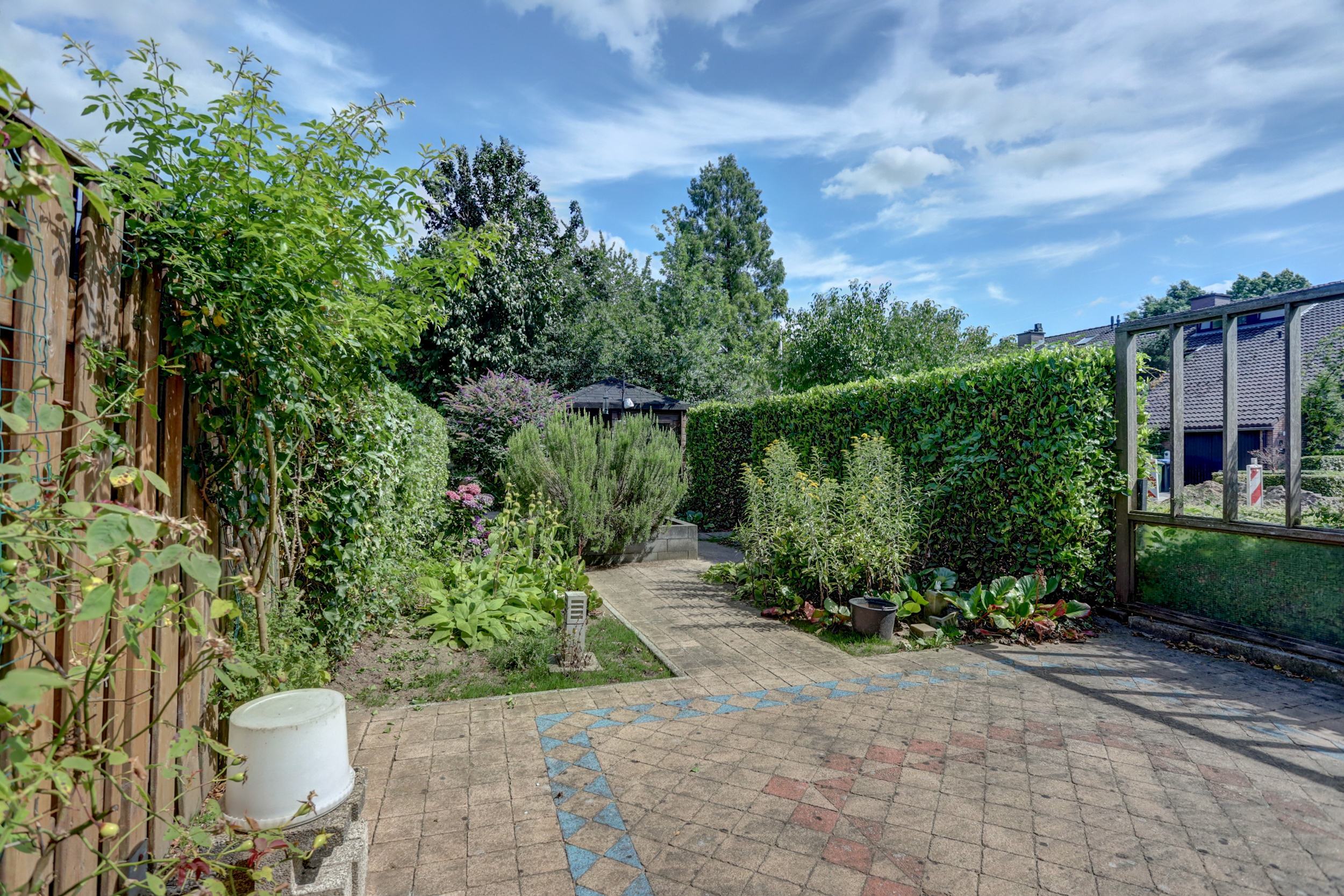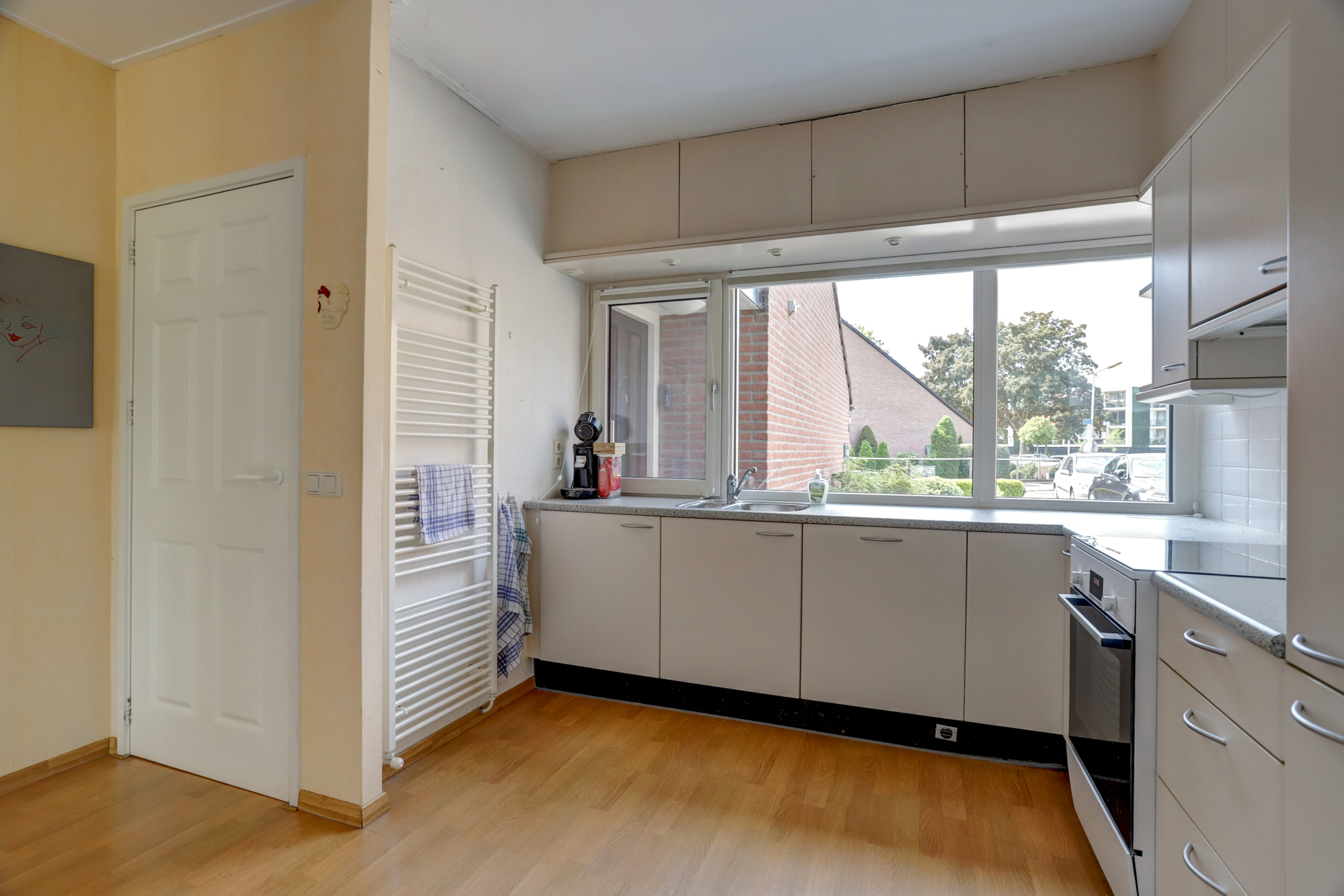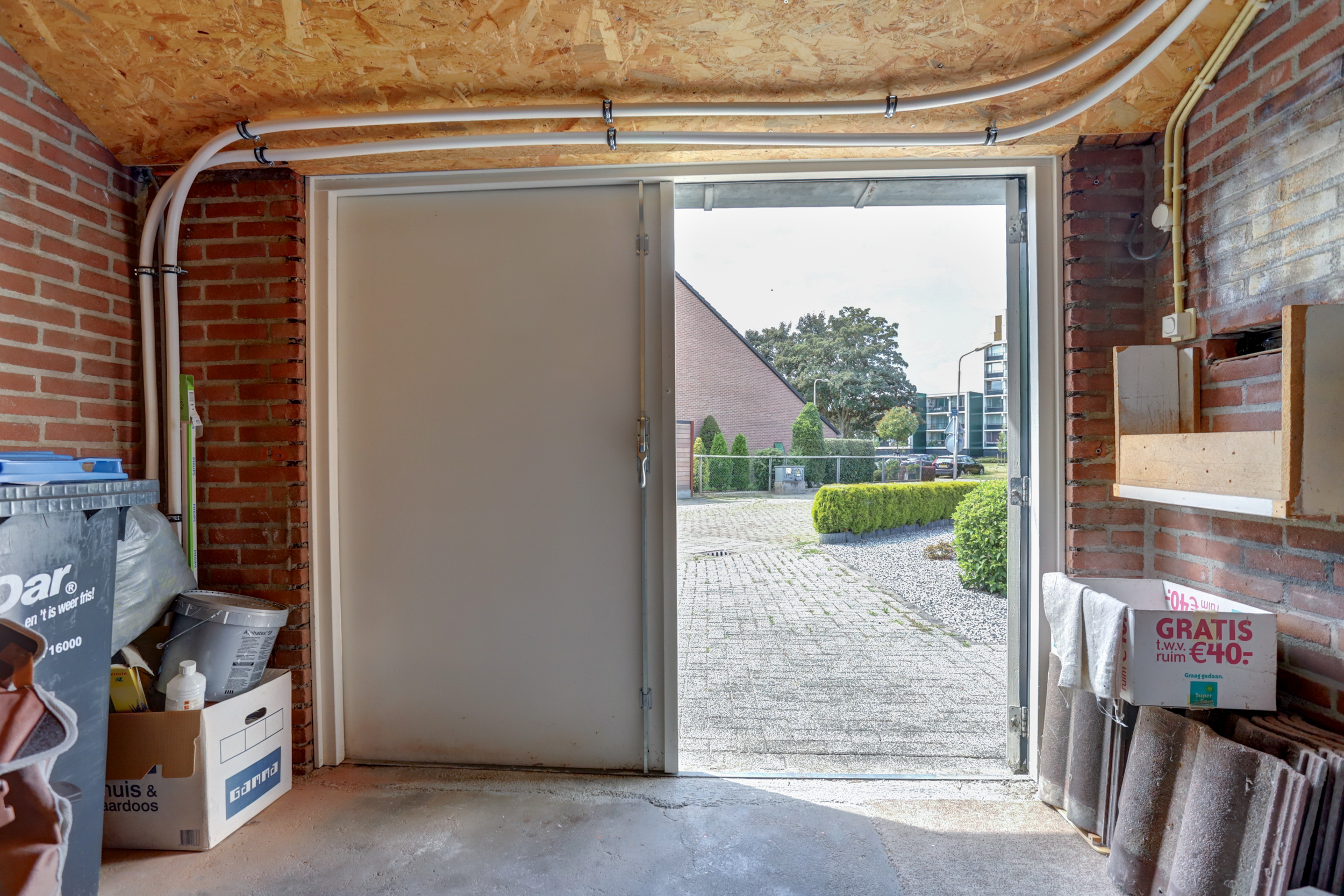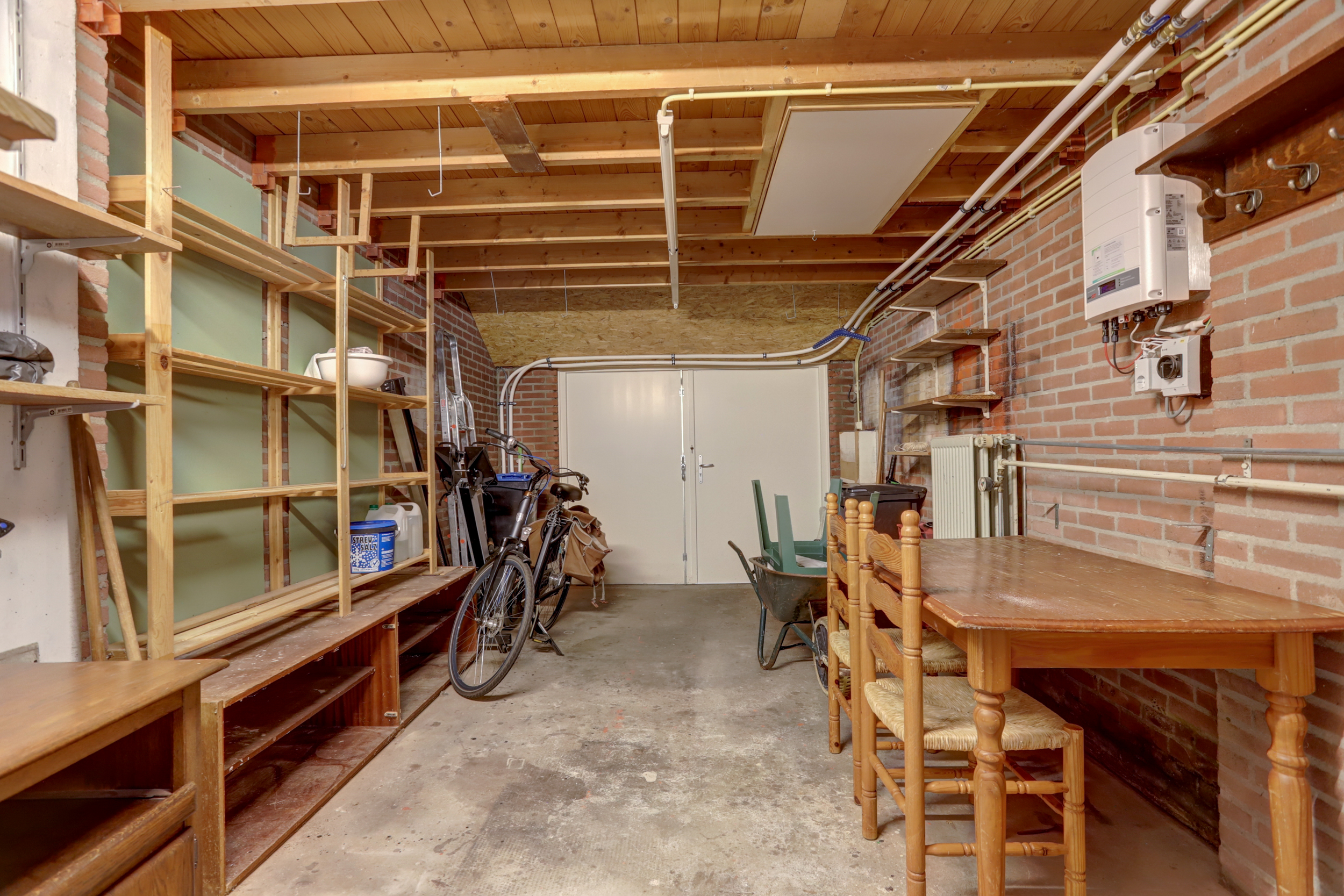 Begane grond: entree, hal, toegang tot de inpandige garage met de wasmachine-aansluiting. De garage heeft een ruime vliering, toegankelijk via een vlizotrap. Toilet, meterkast, aan de voorzijde van de woning is de functionele keuken, de woonkamer ligt aan de achterzijde en kijkt uit over de ruime achtertuin. De tuin is bereikbaar via dubbele tuindeuren en ligt op het zuidoosten. Aan zowel de zijkant als de achterkant grenst het perceel aan gemeentelijk groen.