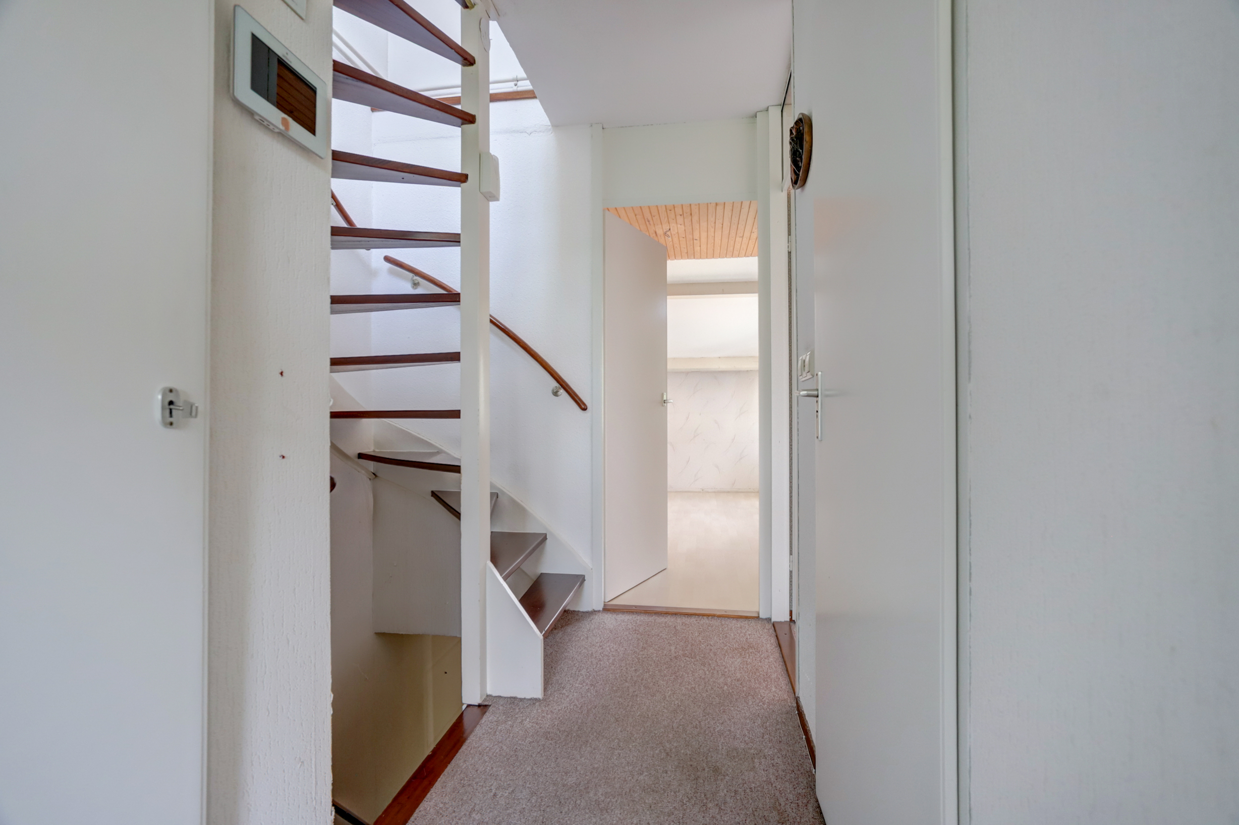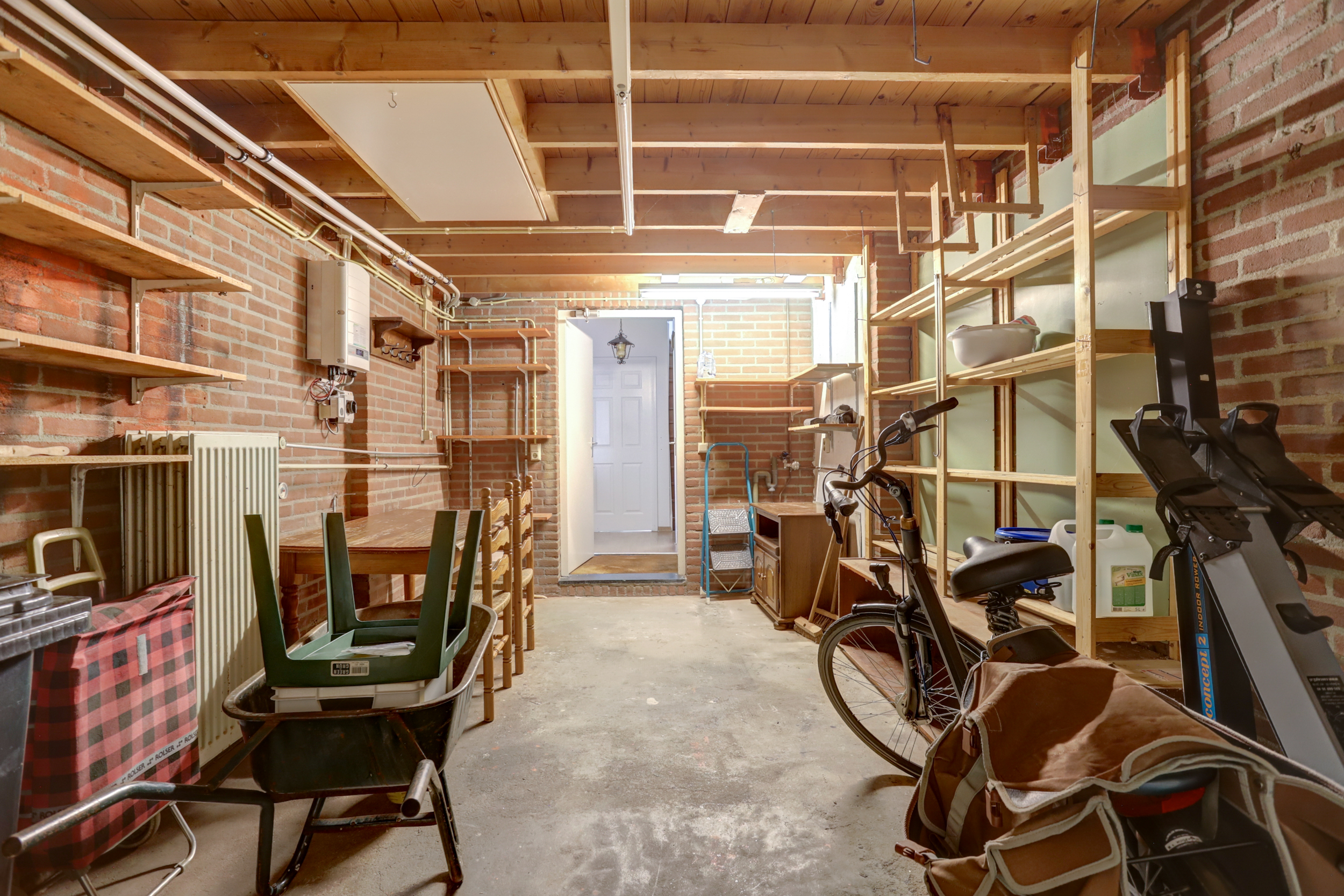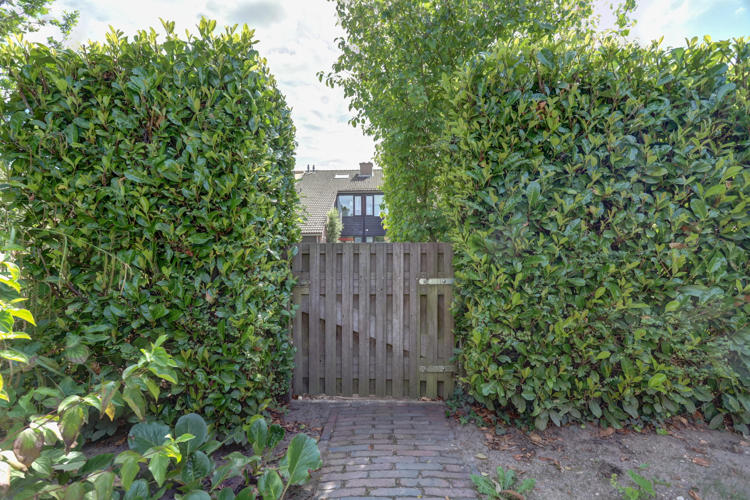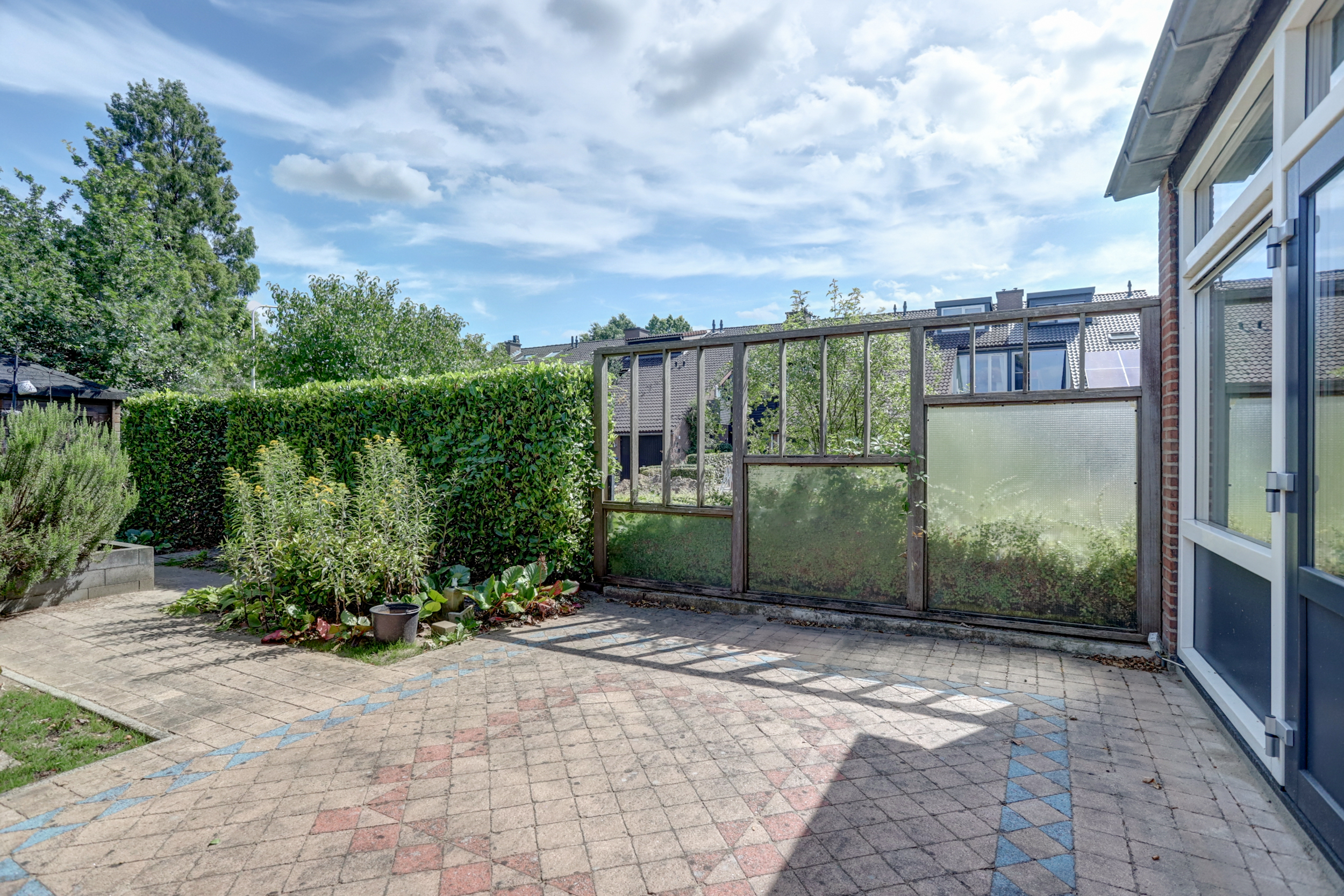 Begane grond: entree, hal, toegang tot de inpandige garage met de wasmachine-aansluiting. De garage heeft een ruime vliering, toegankelijk via een vlizotrap. Toilet, meterkast, aan de voorzijde van de woning is de functionele keuken, de woonkamer ligt aan de achterzijde en kijkt uit over de ruime achtertuin. De tuin is bereikbaar via dubbele tuindeuren en ligt op het zuidoosten. Aan zowel de zijkant als de achterkant grenst het perceel aan gemeentelijk groen.