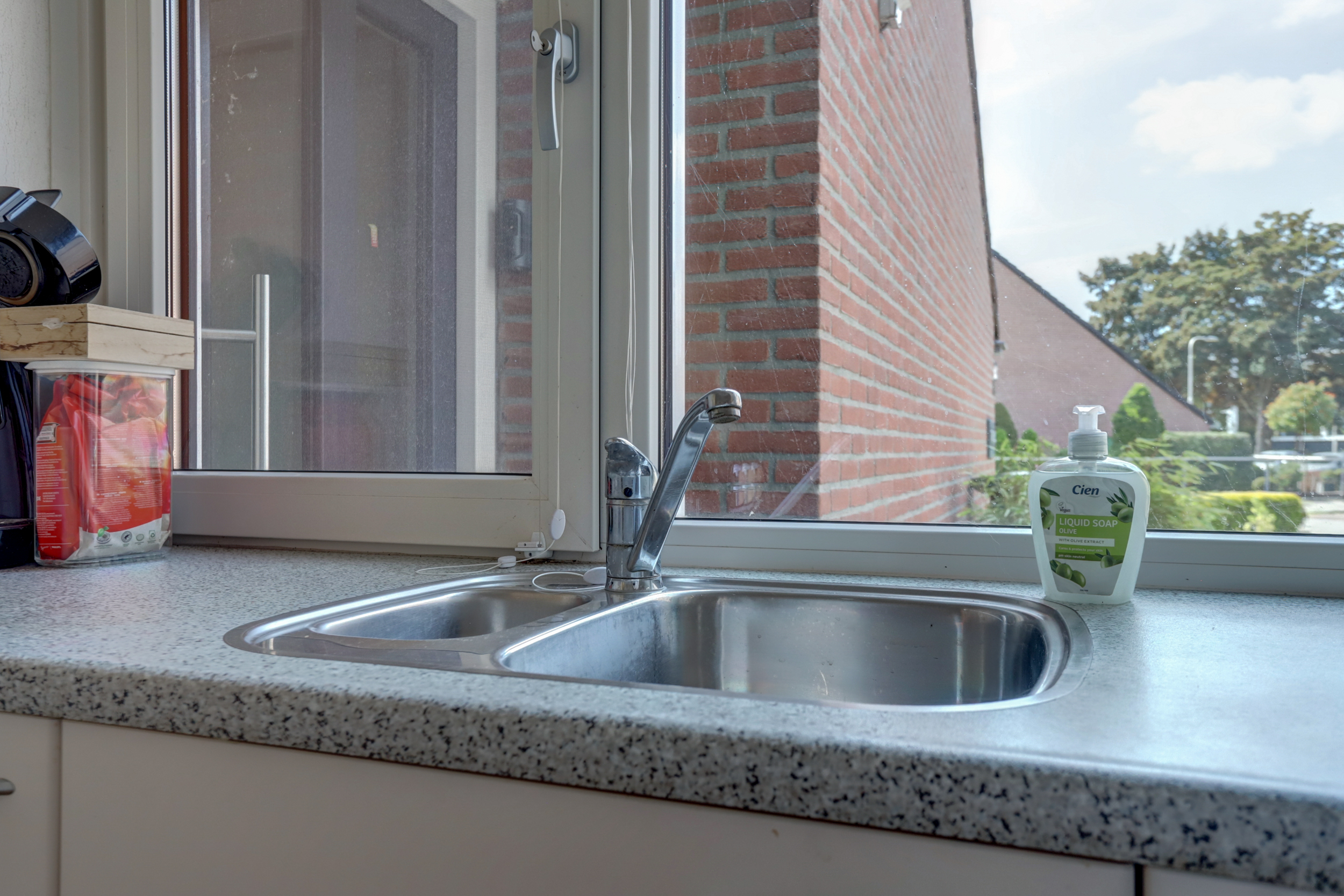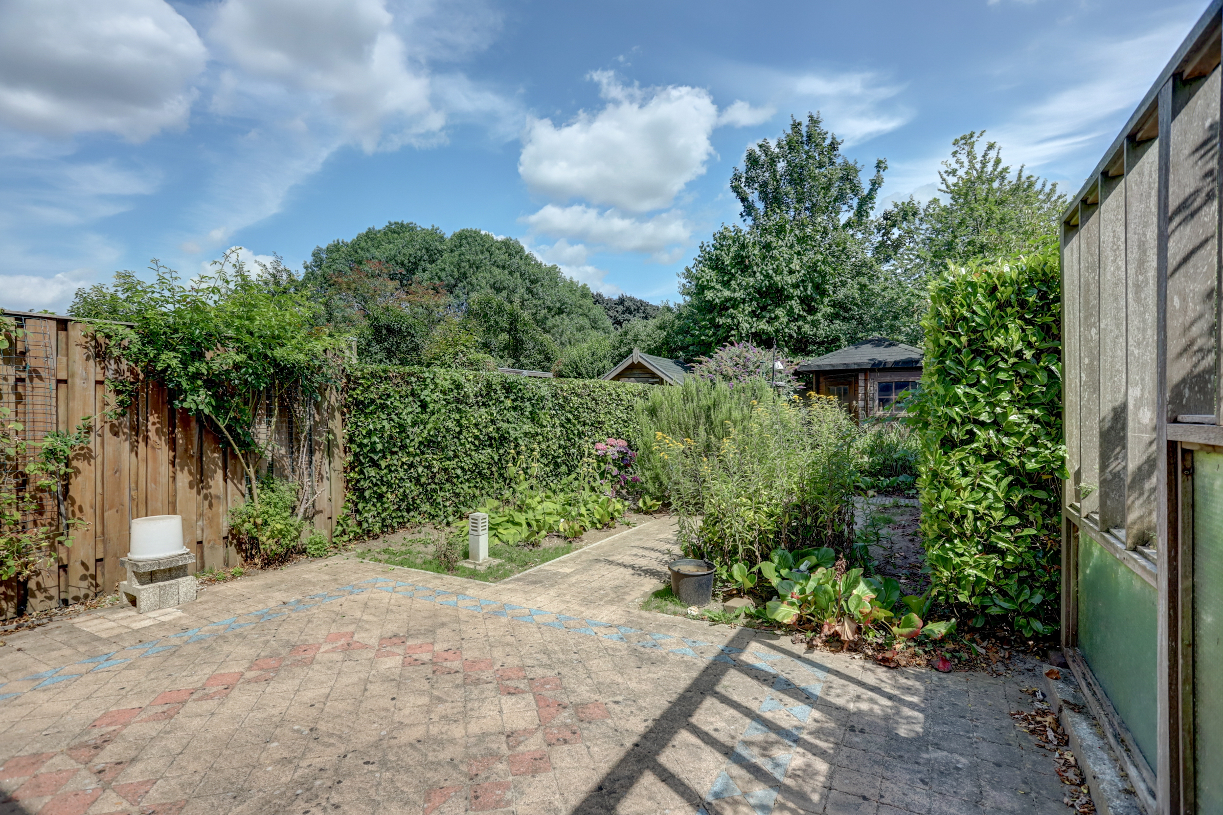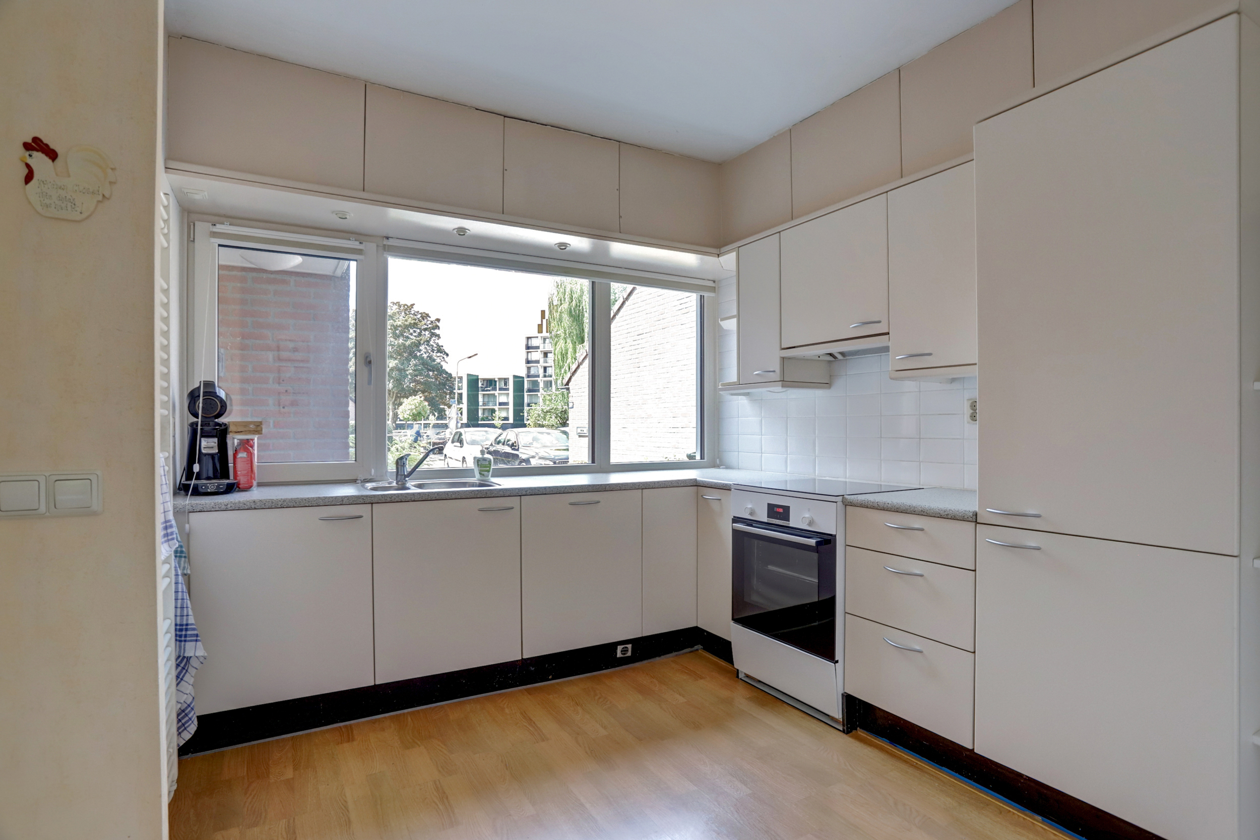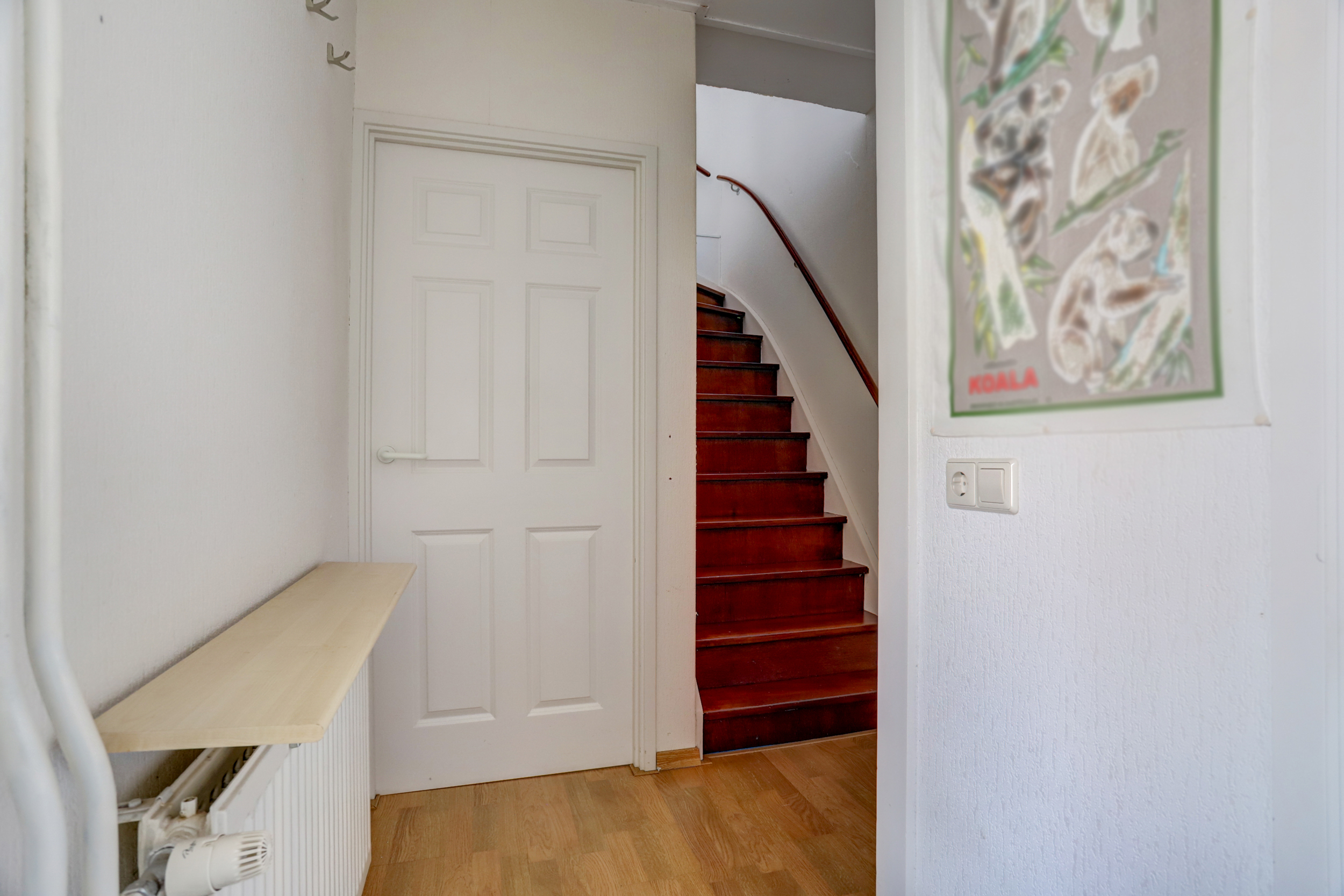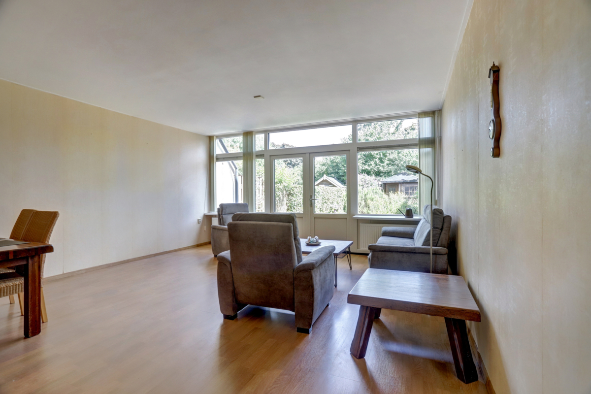 Begane grond: entree, hal, toegang tot de inpandige garage met de wasmachine-aansluiting. De garage heeft een ruime vliering, toegankelijk via een vlizotrap. Toilet, meterkast, aan de voorzijde van de woning is de functionele keuken, de woonkamer ligt aan de achterzijde en kijkt uit over de ruime achtertuin. De tuin is bereikbaar via dubbele tuindeuren en ligt op het zuidoosten. Aan zowel de zijkant als de achterkant grenst het perceel aan gemeentelijk groen.