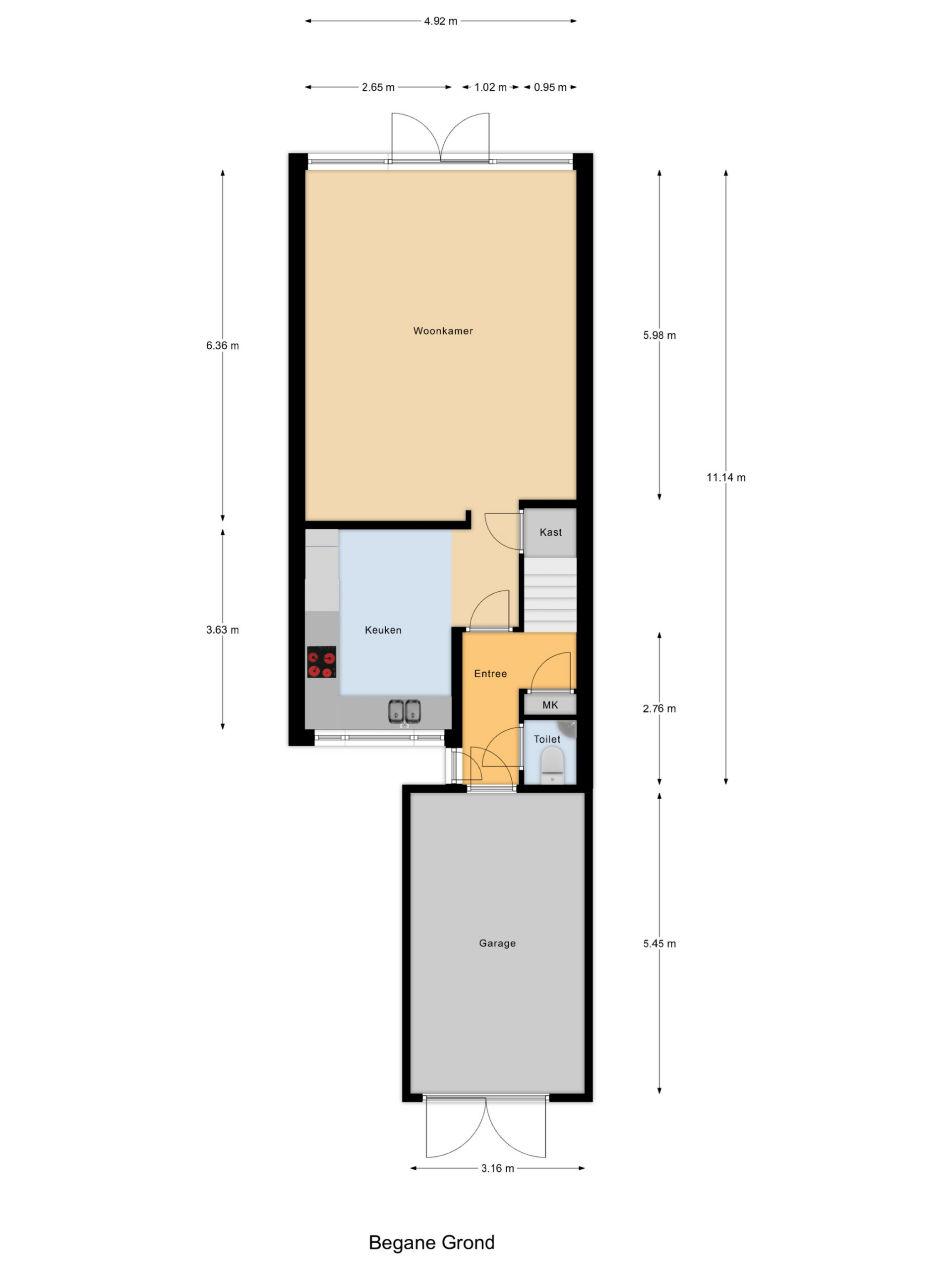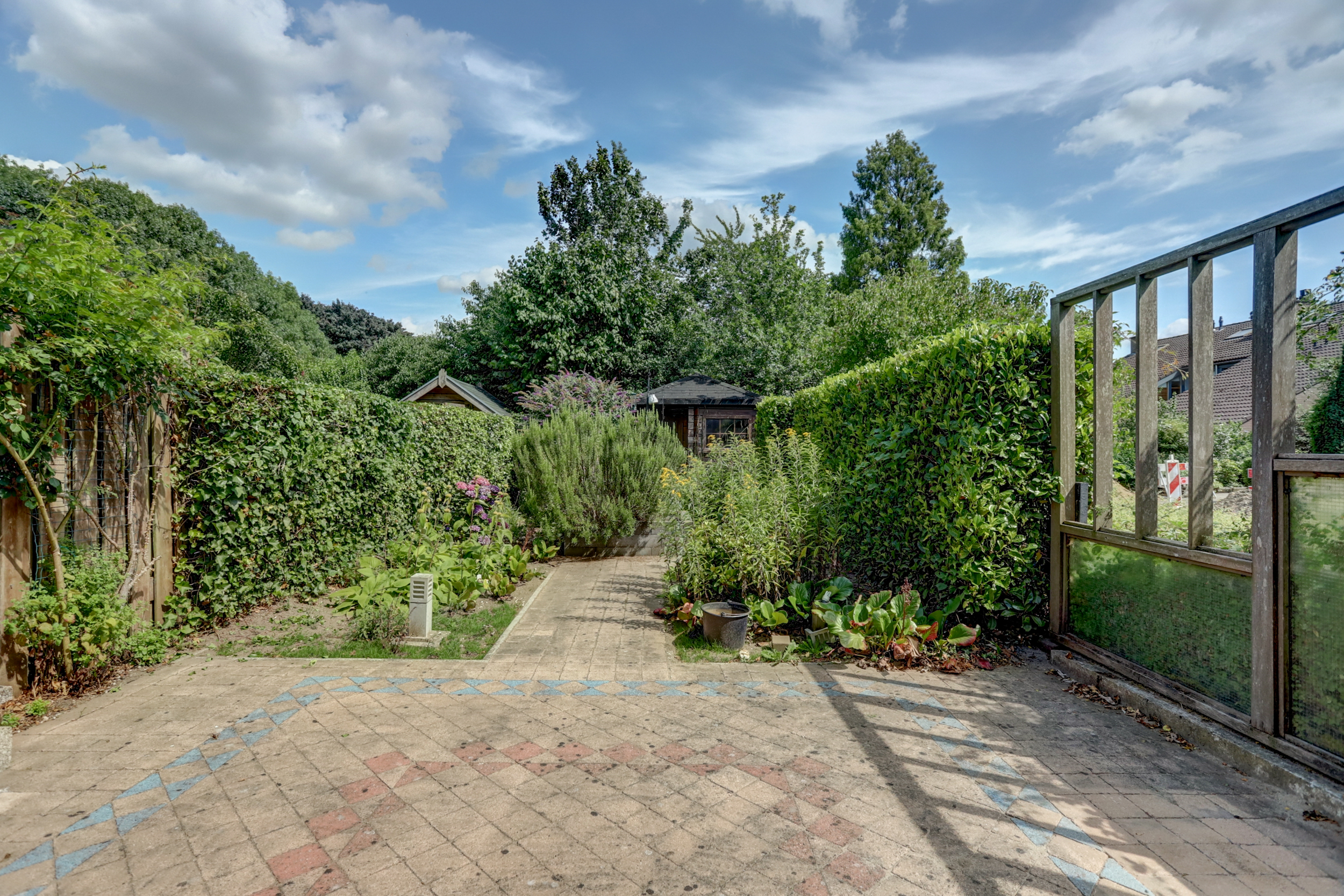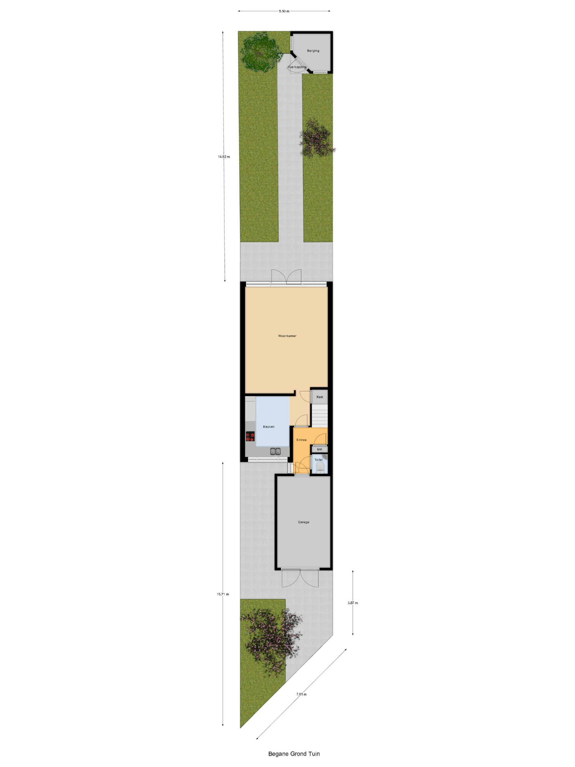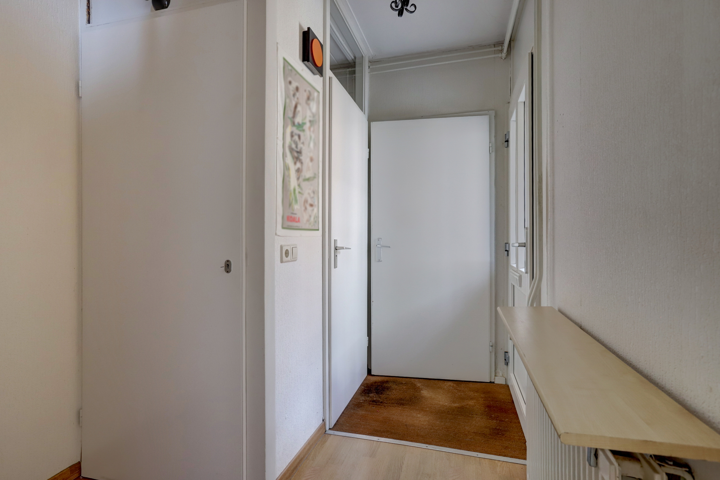 Begane grond: entree, hal, toegang tot de inpandige garage met de wasmachine-aansluiting. De garage heeft een ruime vliering, toegankelijk via een vlizotrap. Toilet, meterkast, aan de voorzijde van de woning is de functionele keuken, de woonkamer ligt aan de achterzijde en kijkt uit over de ruime achtertuin. De tuin is bereikbaar via dubbele tuindeuren en ligt op het zuidoosten. Aan zowel de zijkant als de achterkant grenst het perceel aan gemeentelijk groen.