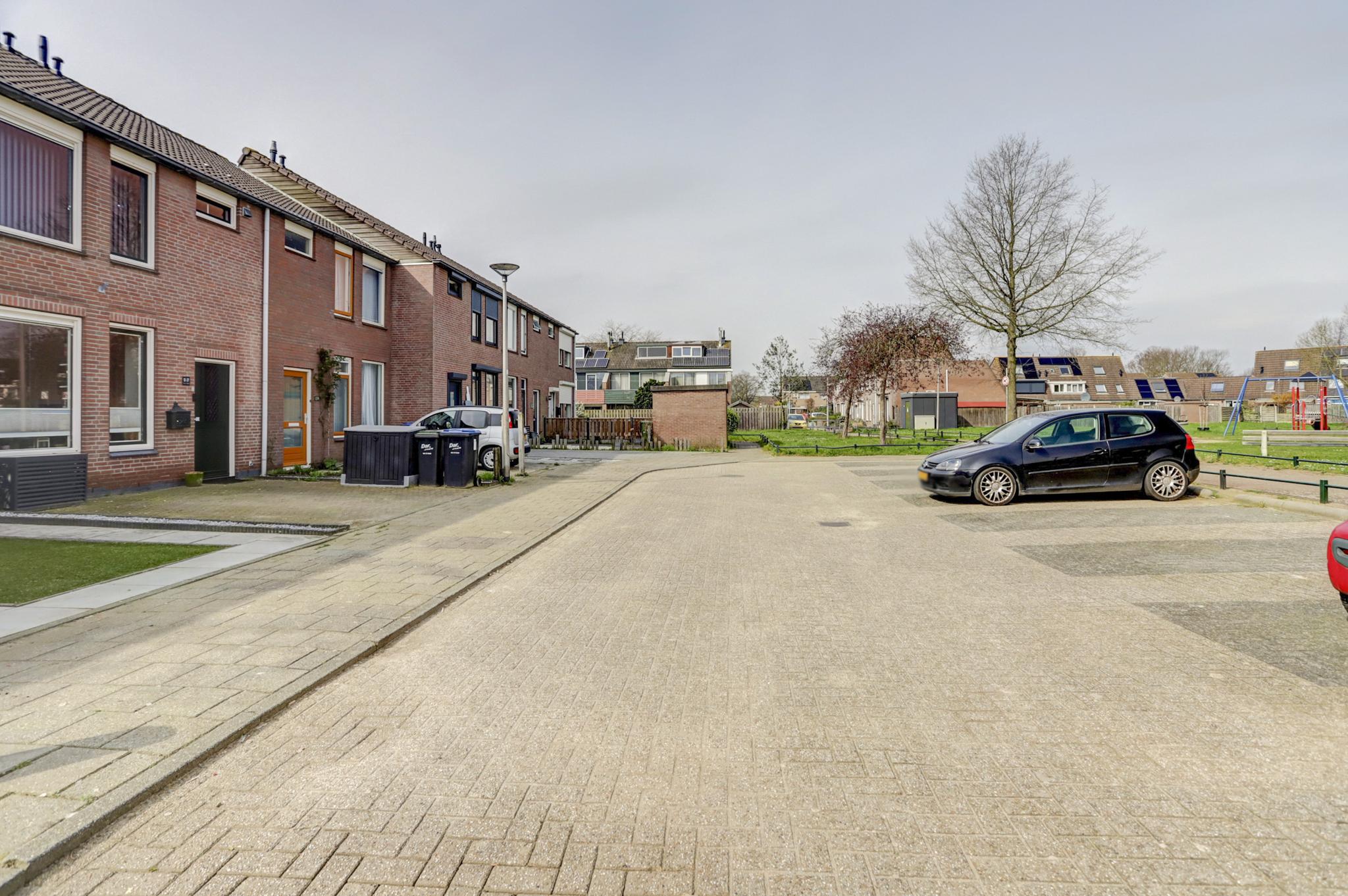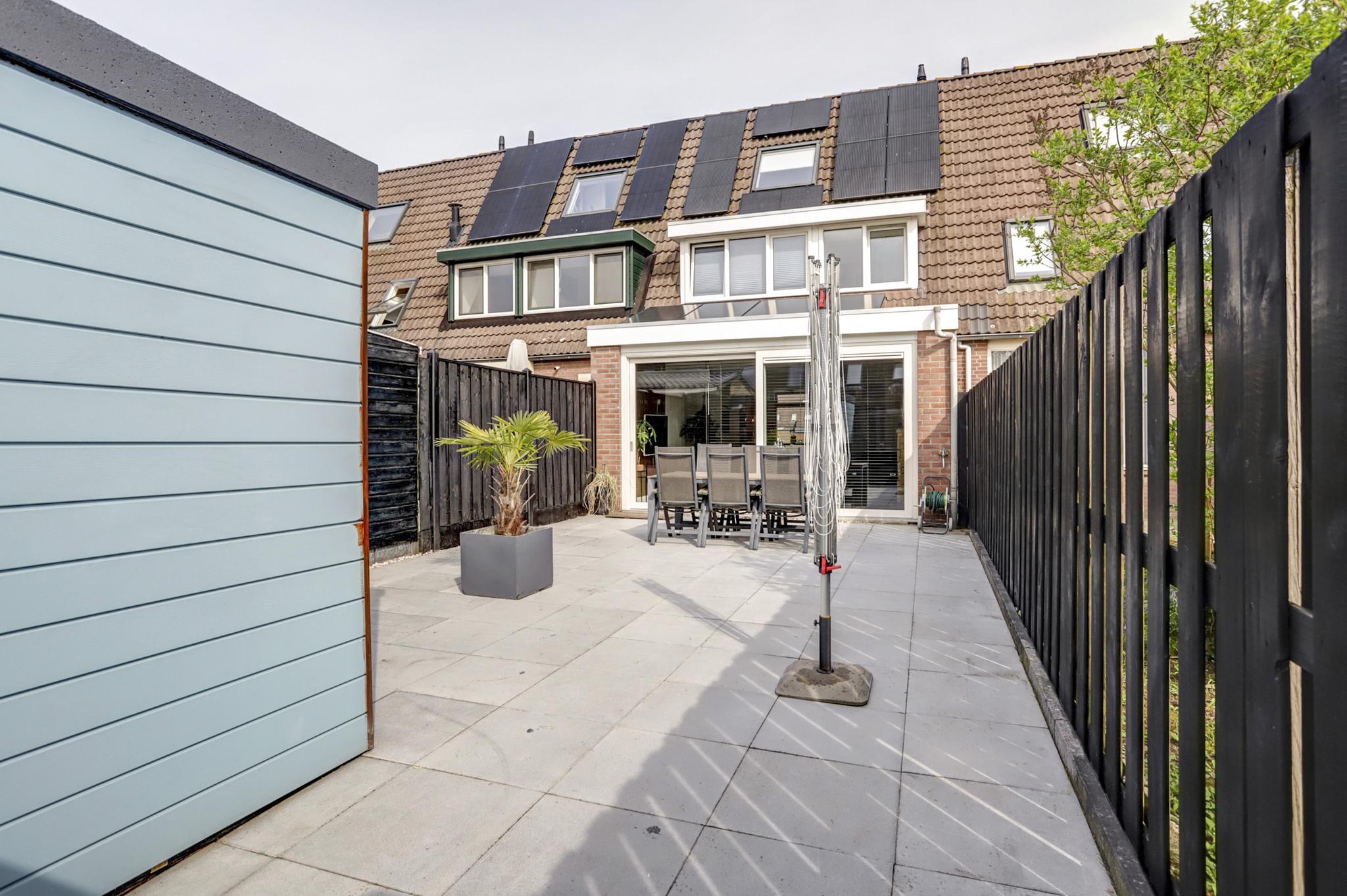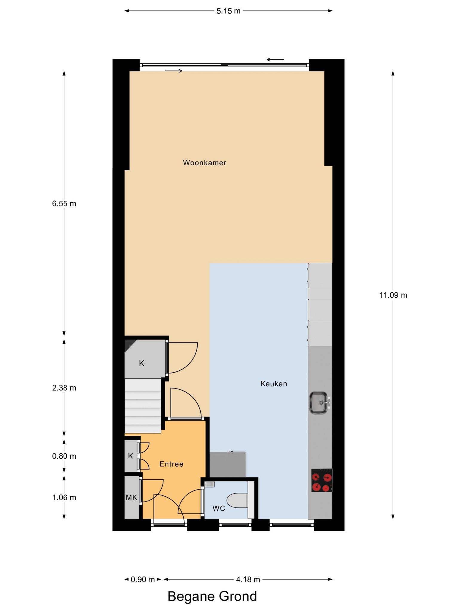 Begane grond: entree, toilet, meterkast, open keuken met moderne en complete inrichting inclusief allerlei apparatuur. De uitgebouwde woonkamer heeft een trapkast en geeft via een schuifpui toegang tot de achtertuin. De achtertuin ligt op het zuidwesten, is voorzien van een achterom en een berging.