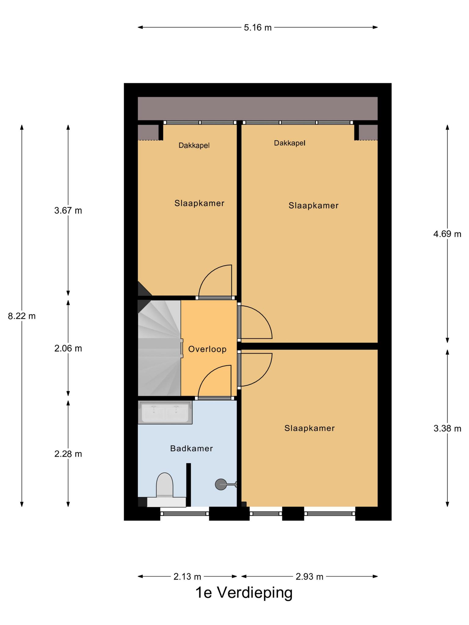 Eerste verdieping: overloop, 3 slaapkamers, moderne badkamer met vloerverwarming, wastafelmeubel, wandcloset en inloopdouche.