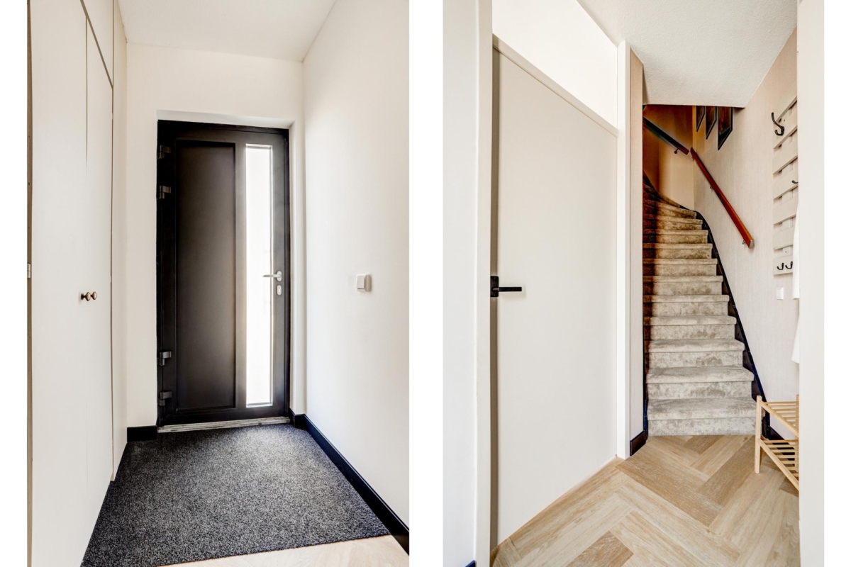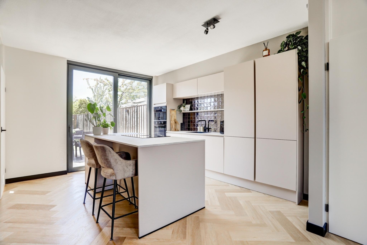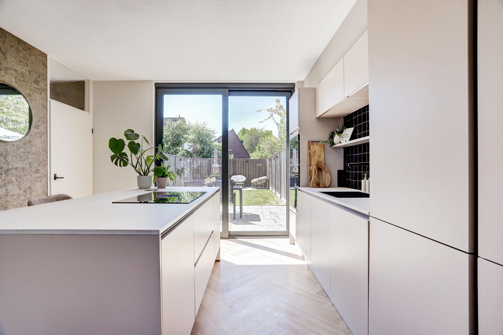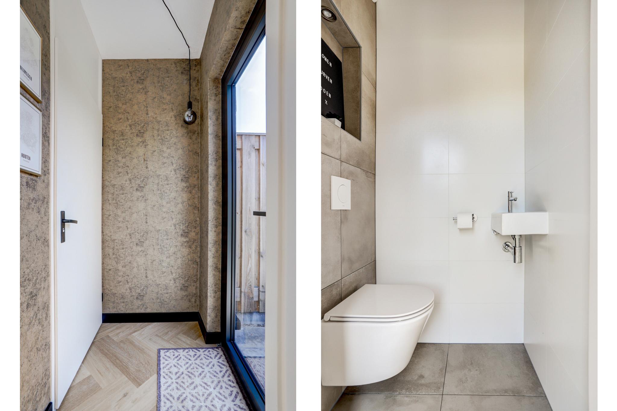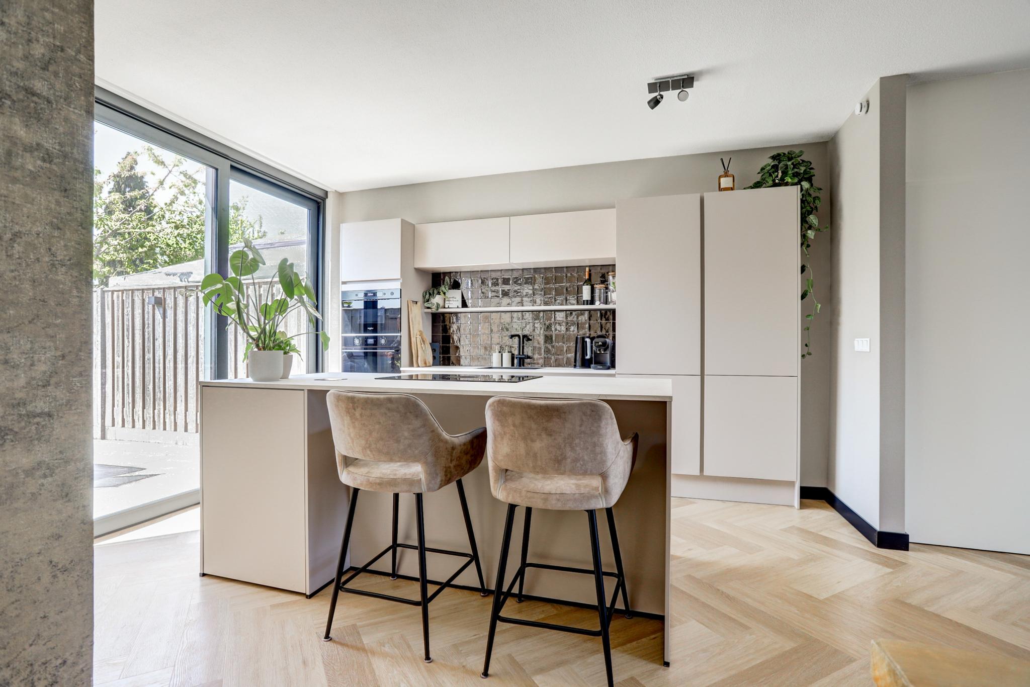 Begane grond: entree, hal met meterkast, lichte woonkamer aan de voorzijde die is voorzien van een praktische opbergkast, moderne en recent vernieuwde keuken (2024) met kookeiland en alle gewenste inbouwapparatuur. Via een tussenportaal en de schuifpui bij de keuken zijn een toilet en de achterdeur naar de tuin bereikbaar.