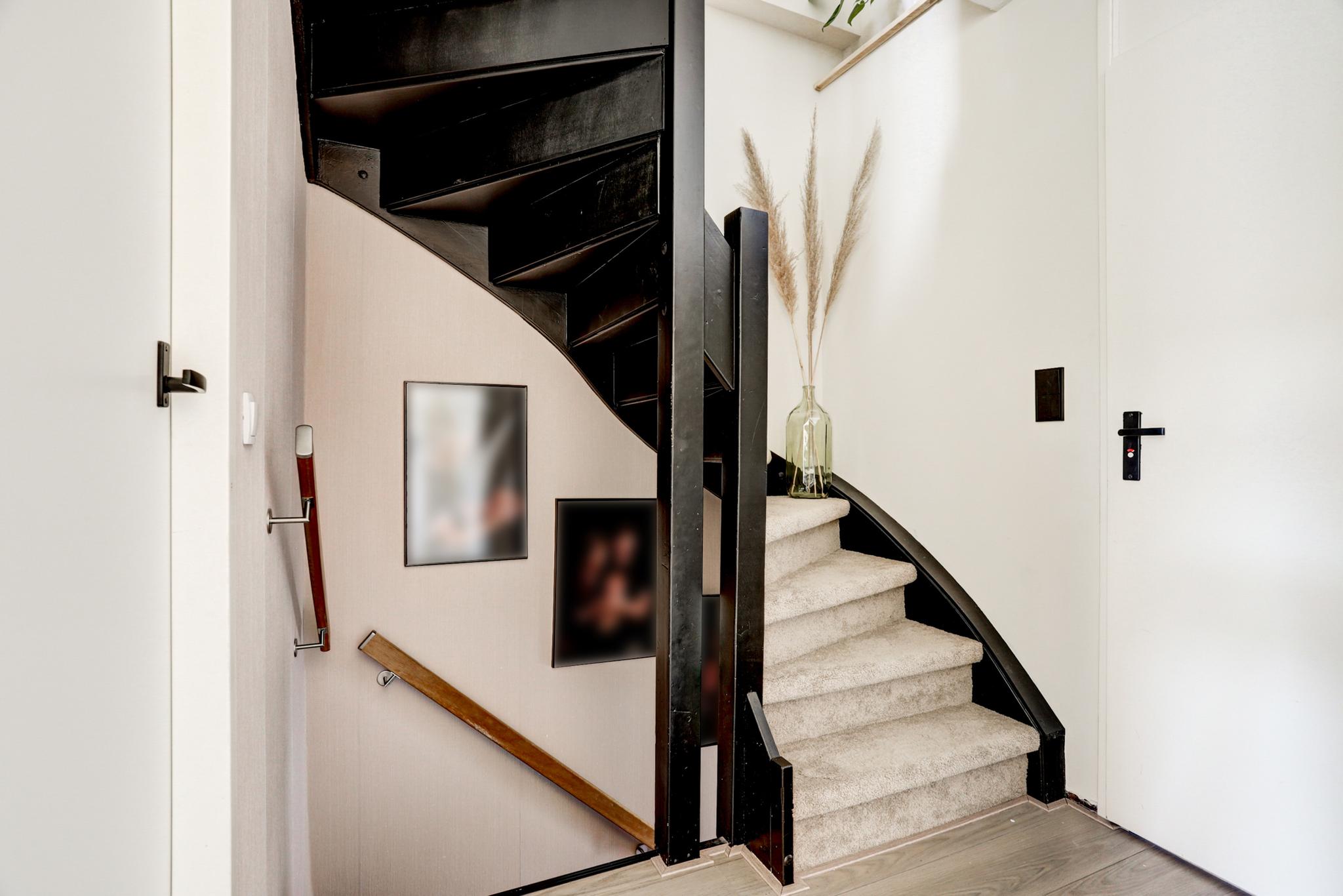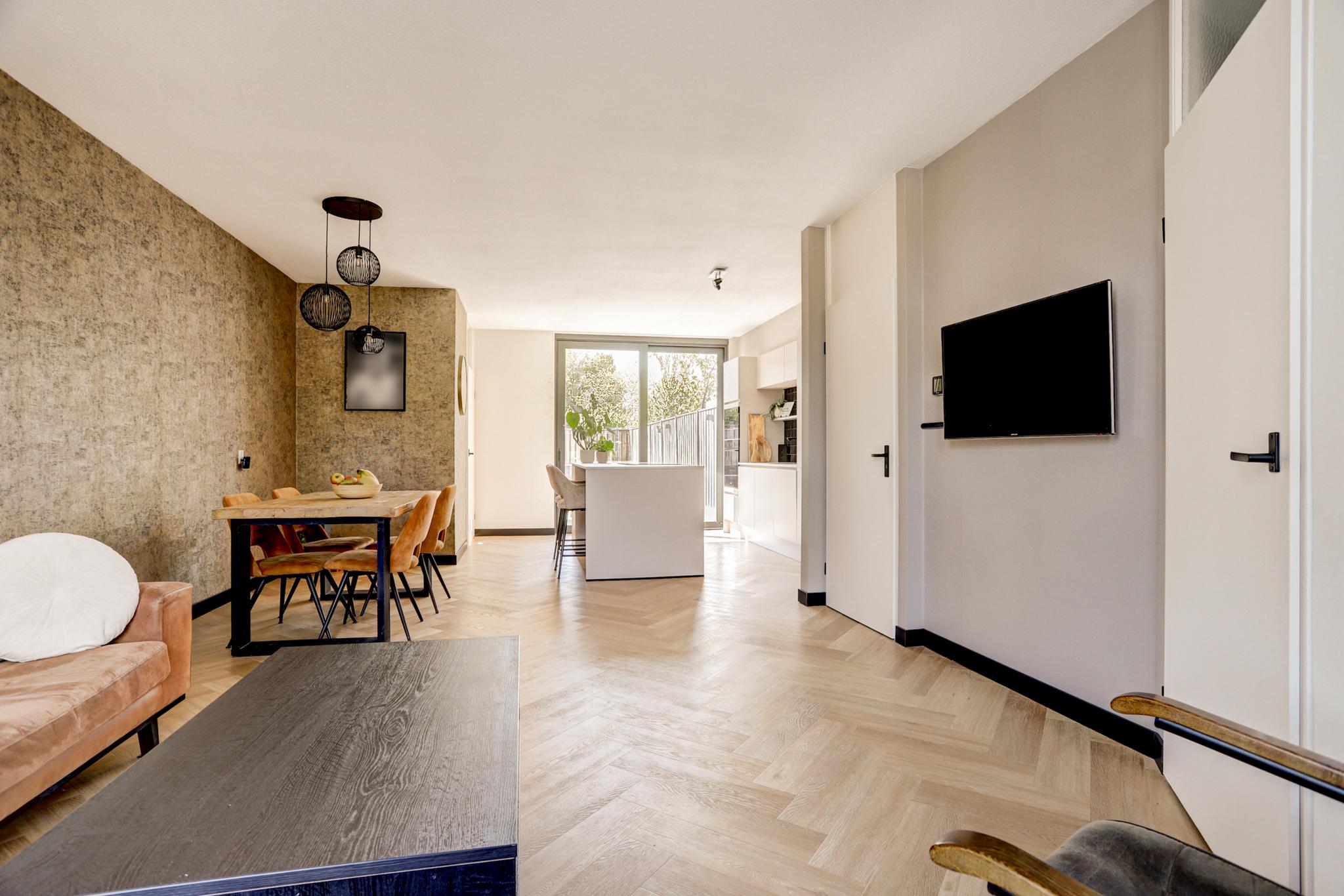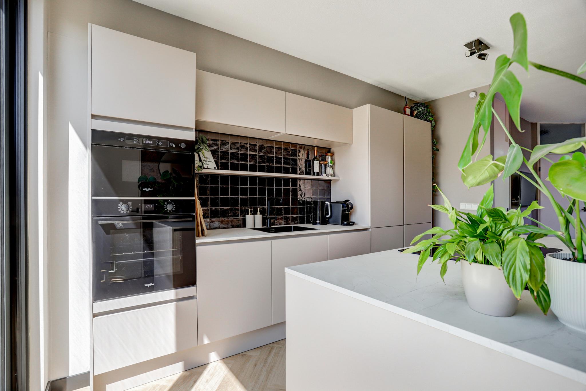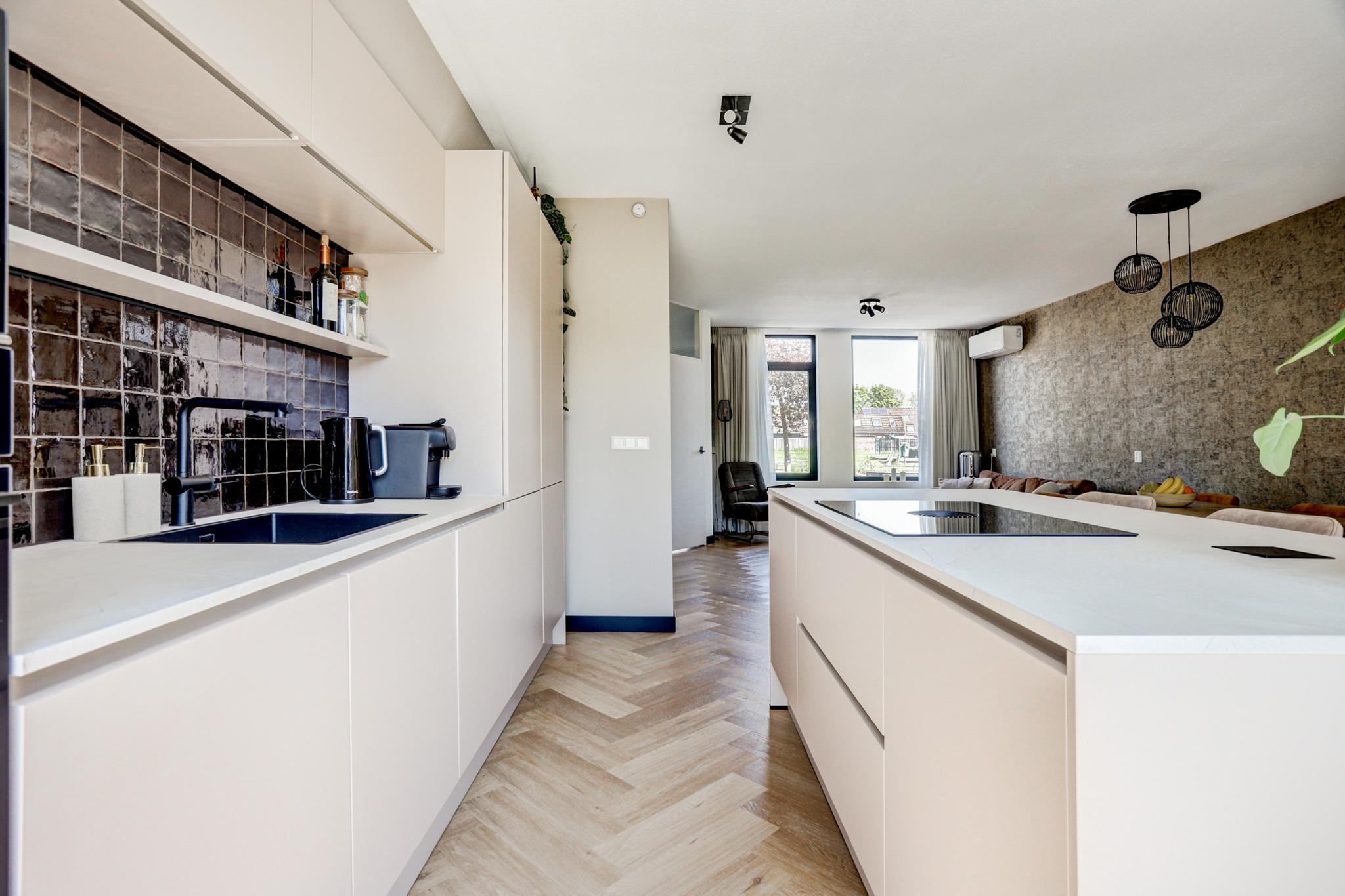 Begane grond: entree, hal met meterkast, lichte woonkamer aan de voorzijde die is voorzien van een praktische opbergkast, moderne en recent vernieuwde keuken (2024) met kookeiland en alle gewenste inbouwapparatuur. Via een tussenportaal en de schuifpui bij de keuken zijn een toilet en de achterdeur naar de tuin bereikbaar.