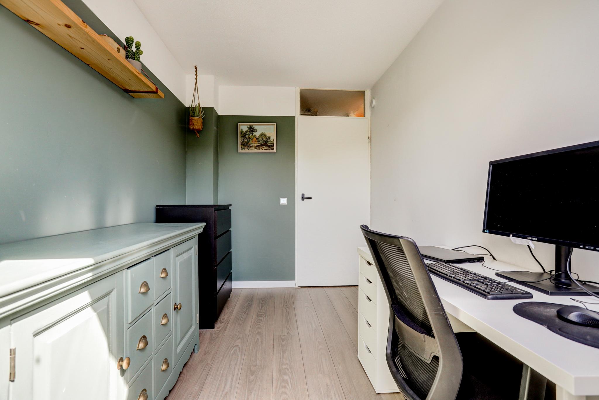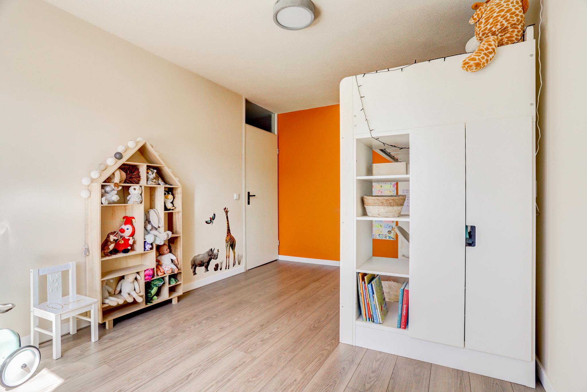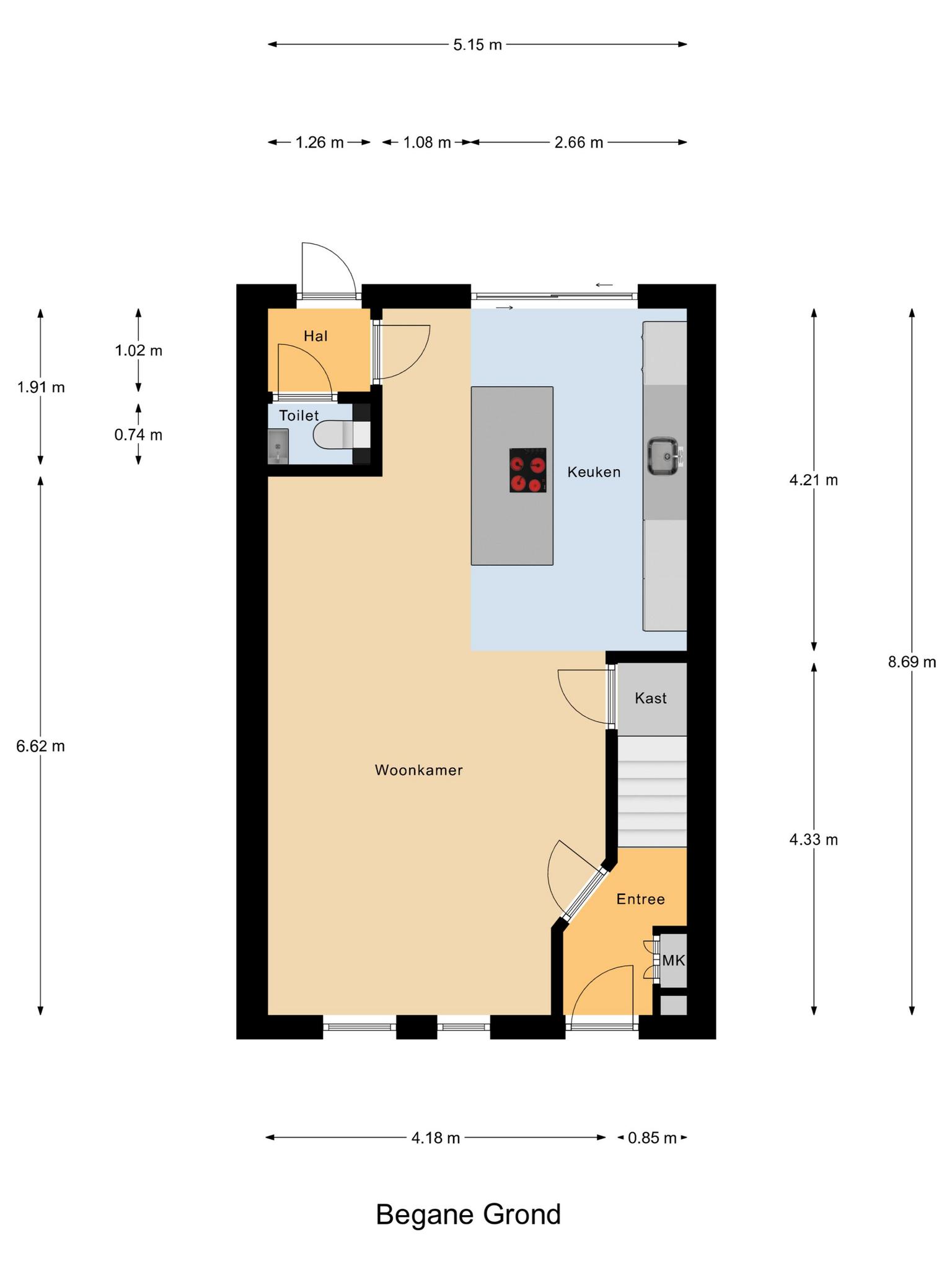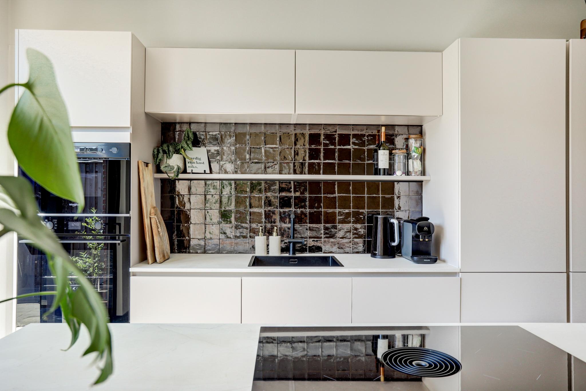 Begane grond: entree, hal met meterkast, lichte woonkamer aan de voorzijde die is voorzien van een praktische opbergkast, moderne en recent vernieuwde keuken (2024) met kookeiland en alle gewenste inbouwapparatuur. Via een tussenportaal en de schuifpui bij de keuken zijn een toilet en de achterdeur naar de tuin bereikbaar.