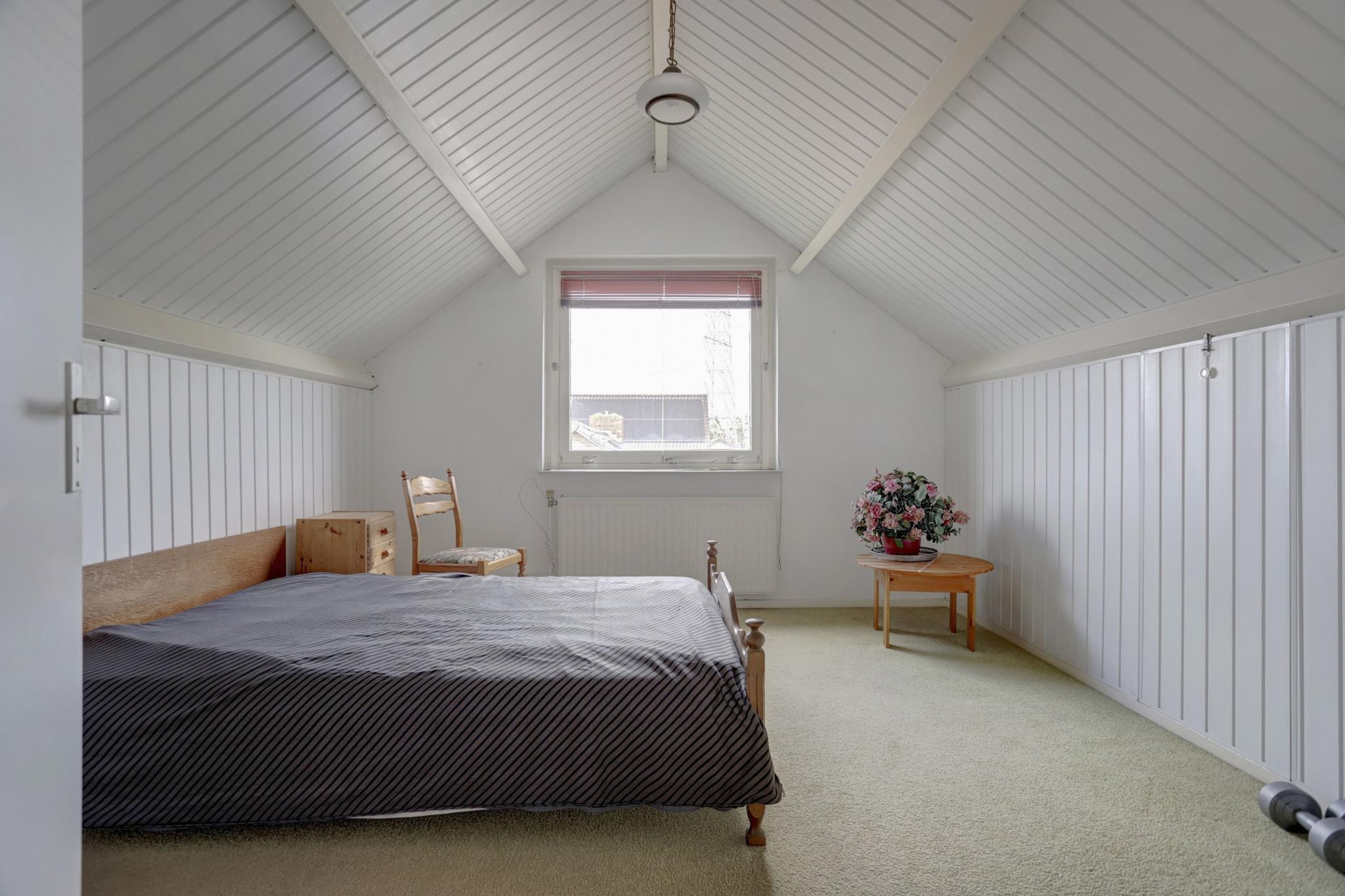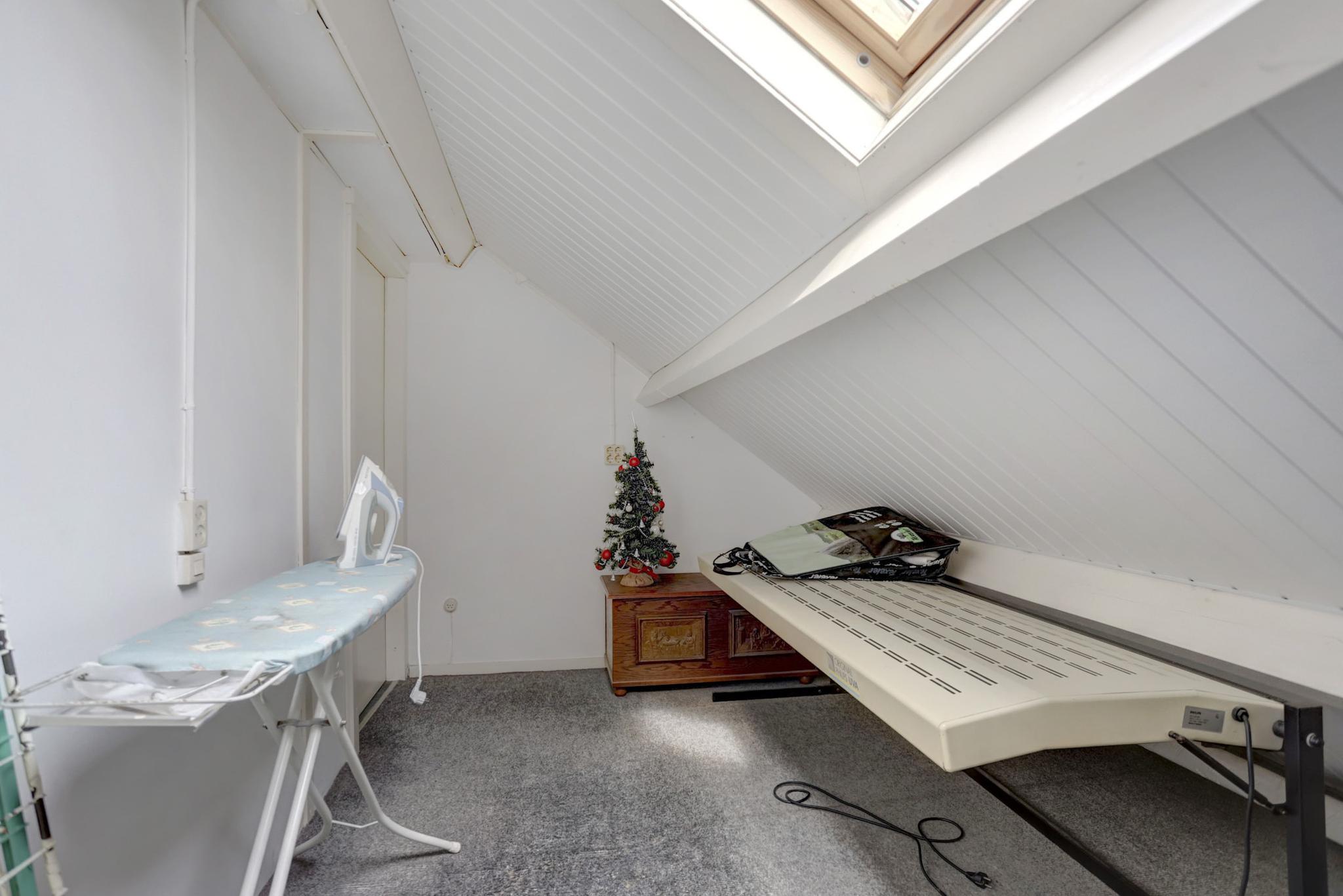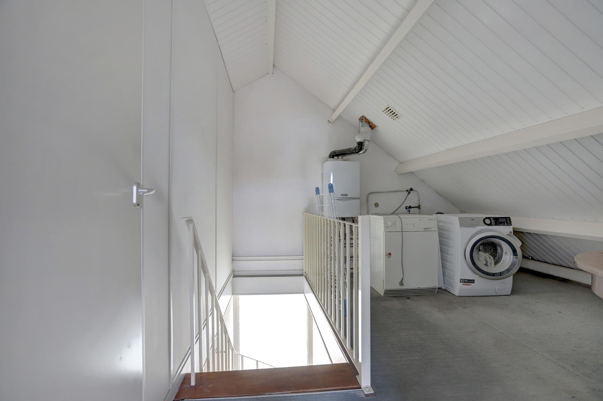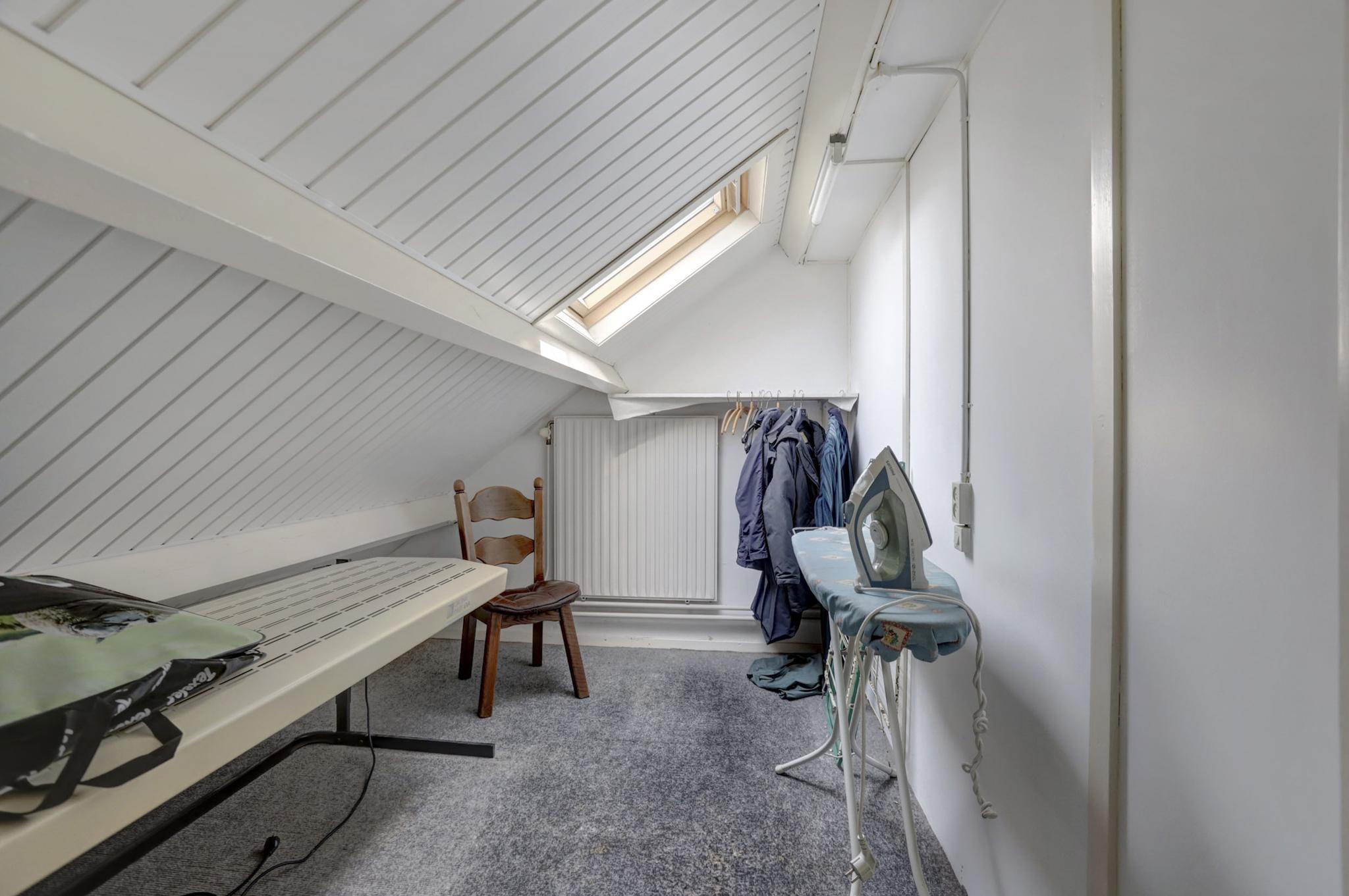 Tweede verdieping: via een vaste trap bereik je de voorzolder die voorzien is van een wasmachine-aansluiting, cv-ketel en de nodige bergruimte. Een strijkkamer met dakraam geeft nog meer bergruimte. Tevens is op deze verdieping de vierde slaapkamer die is voorzien van knieschotten met bergruimte en een vaste wastafel.