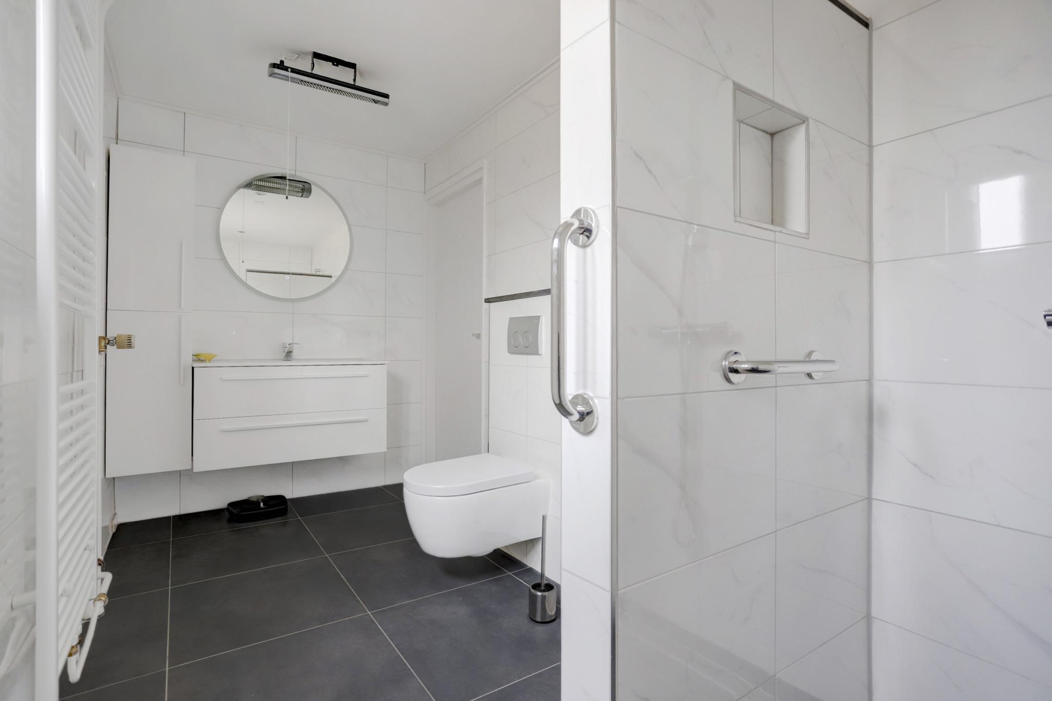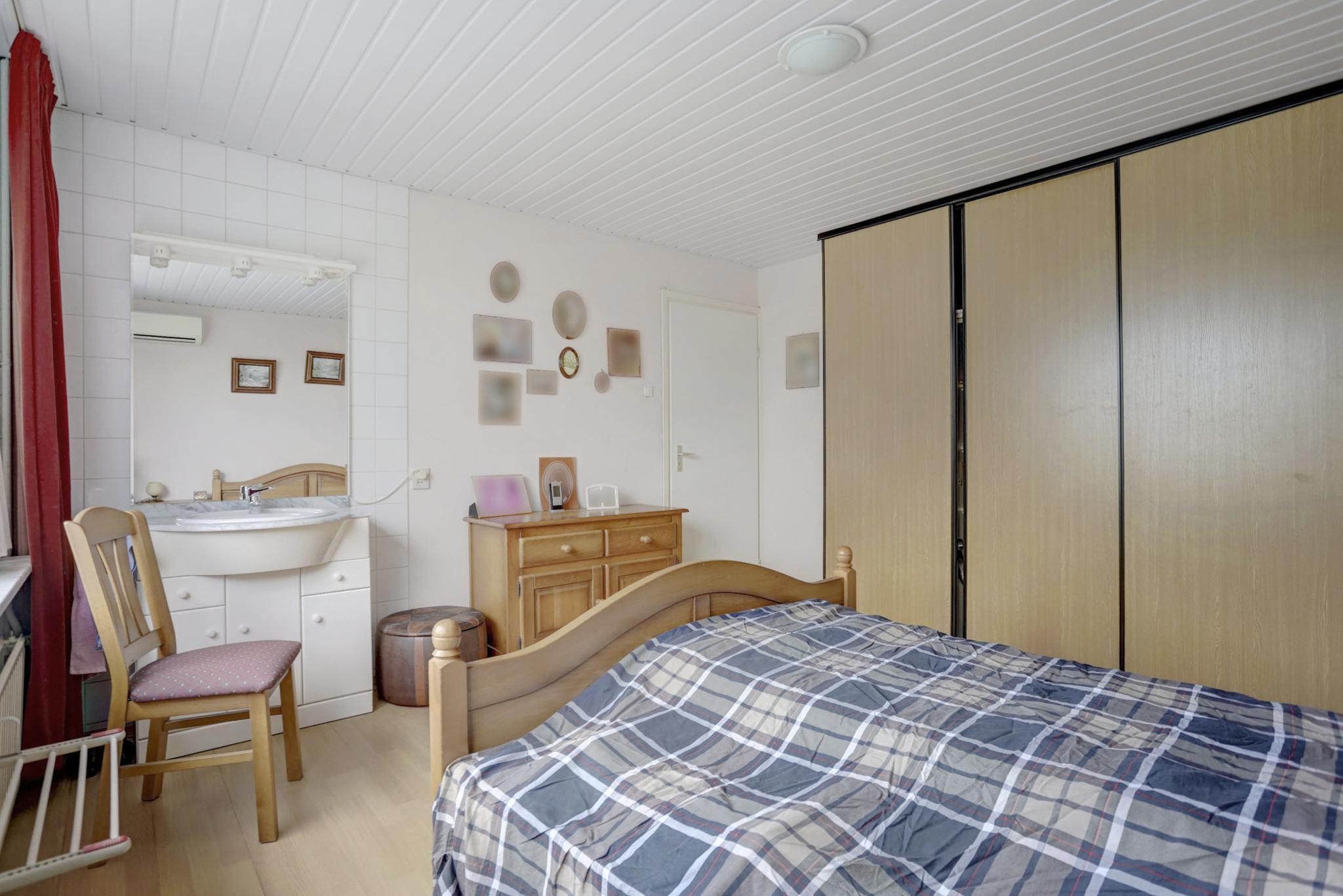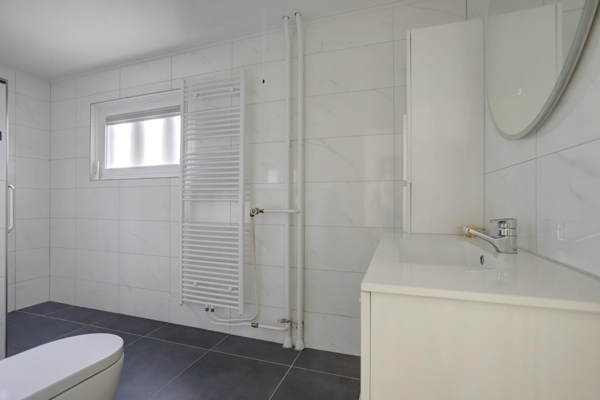 Eerste verdieping: overloop, in totaal drie slaapkamers (ca. 11, 12 en 16 m2) waarvan een slaapkamer met airco en wastafelmeubel. De in 2021 vernieuwde en volledig betegelde badkamer heeft een wandcloset, wastafelmeubel en een douche.