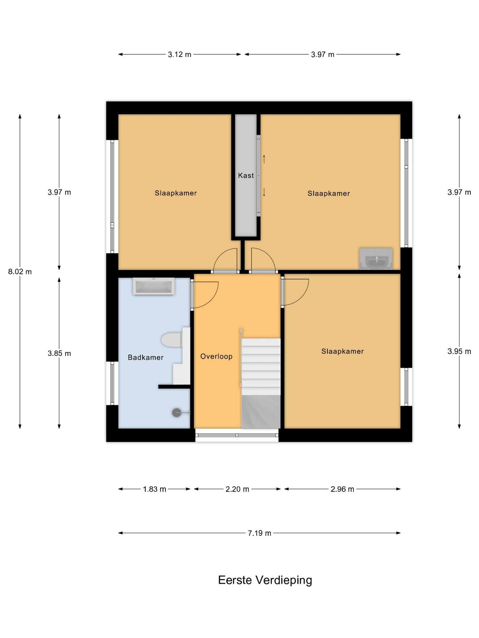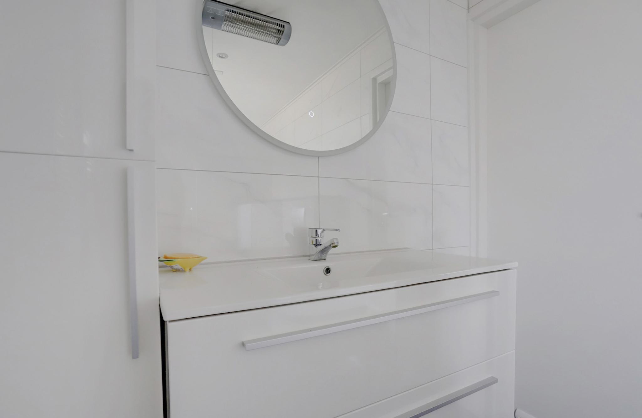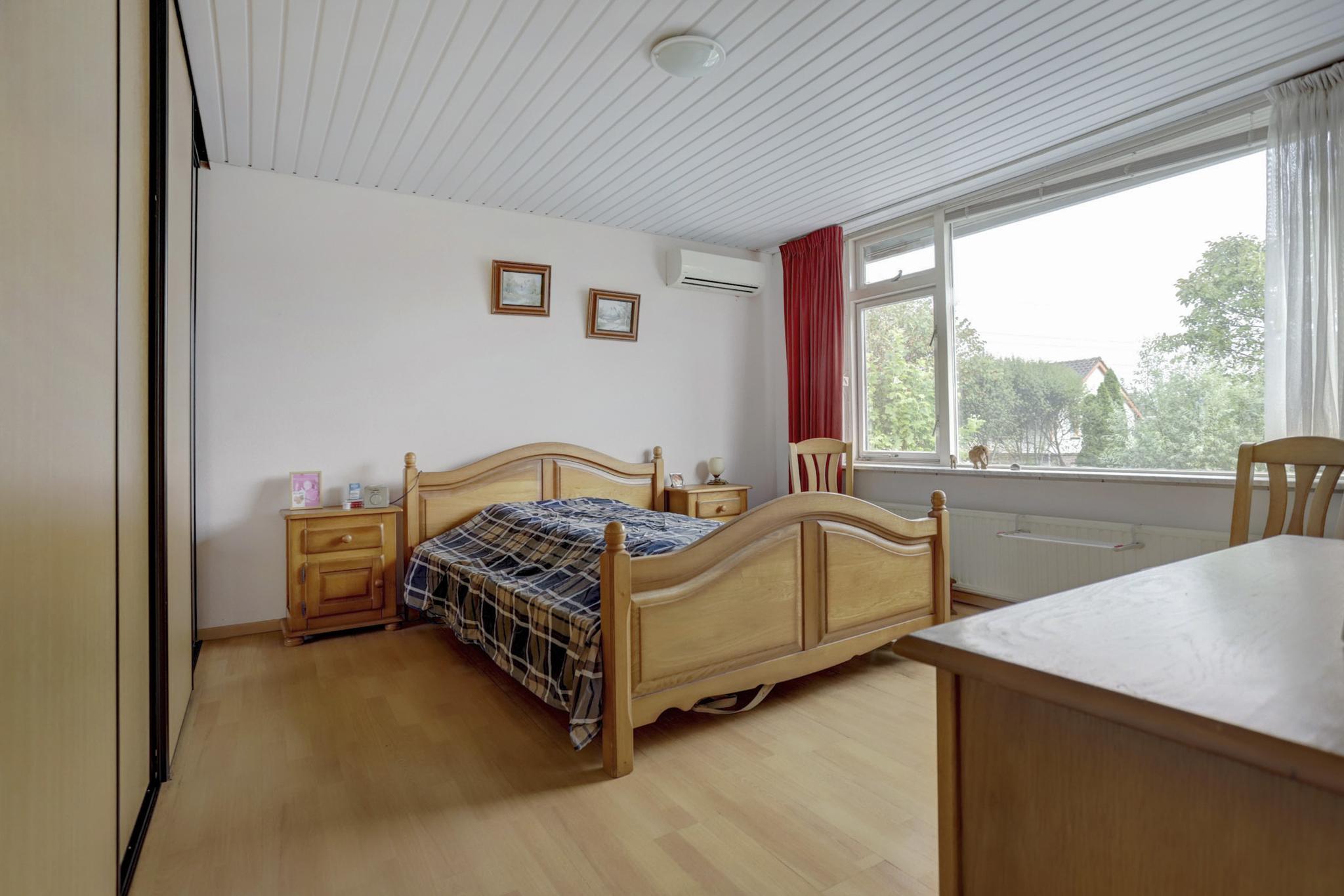 Eerste verdieping: overloop, in totaal drie slaapkamers (ca. 11, 12 en 16 m2) waarvan een slaapkamer met airco en wastafelmeubel. De in 2021 vernieuwde en volledig betegelde badkamer heeft een wandcloset, wastafelmeubel en een douche.