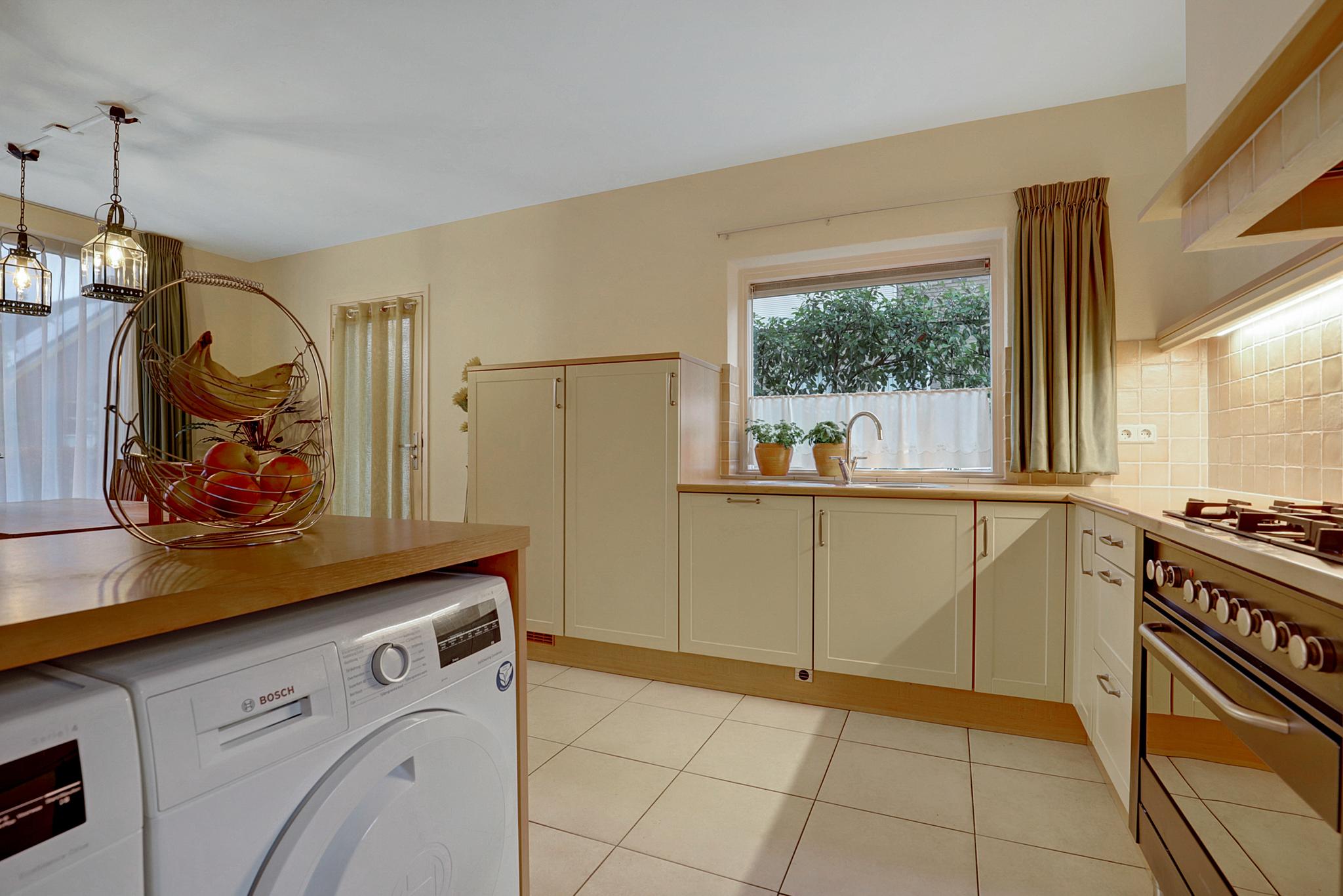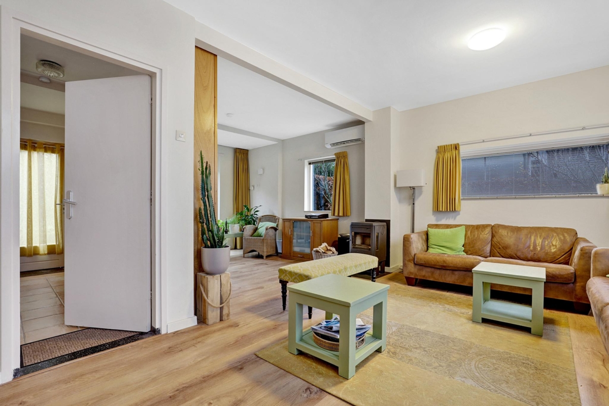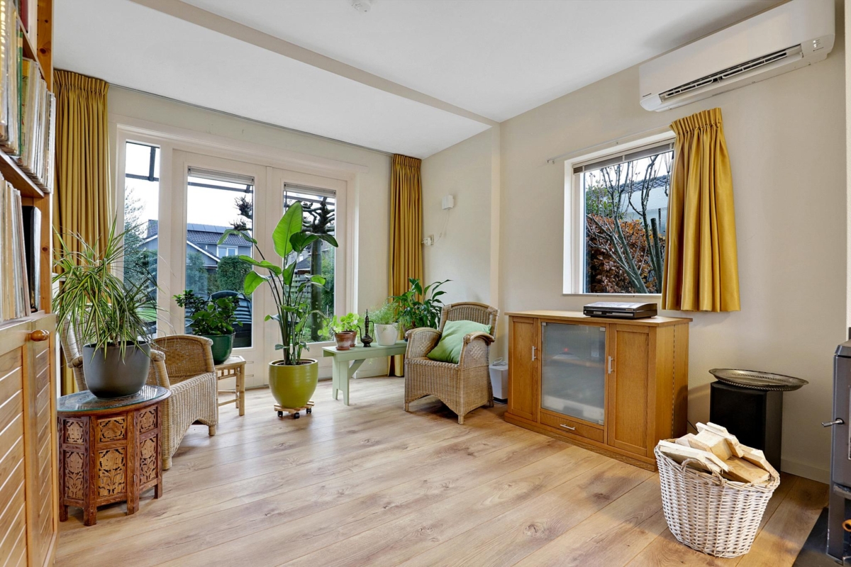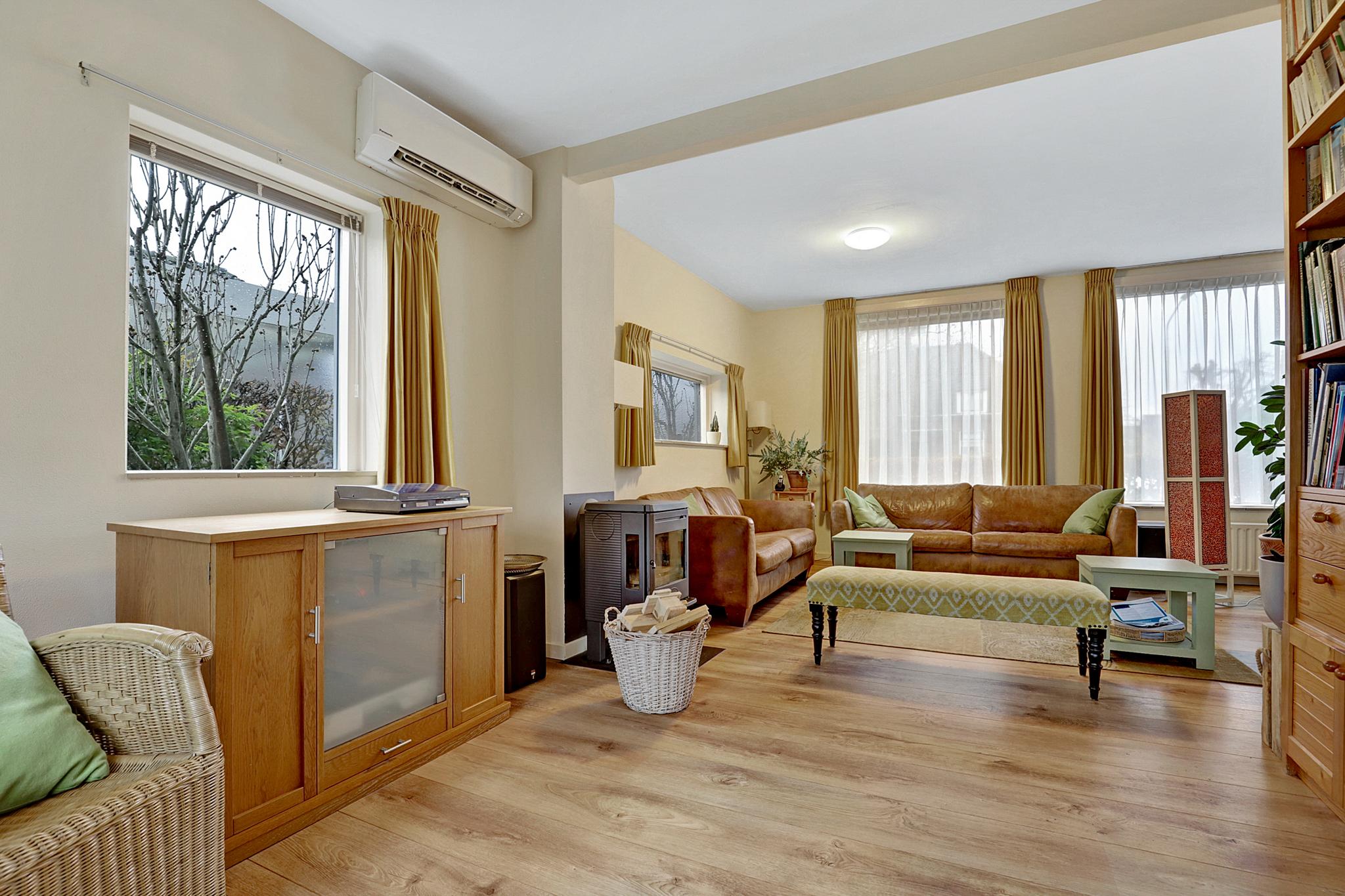 Begane grond: entree in de woonkeuken met vaste kast en een uitgebreide keukeninrichting inclusief diverse inbouwapparatuur en een wasmachine-aansluiting (netjes weggewerkt in een keukenkast). De L-vormige woonkamer heeft terrasdeuren naar de achtertuin en is voorzien van een houtkachel en een airco-unit. Door de grote raampartijen is dit een lichte kamer.