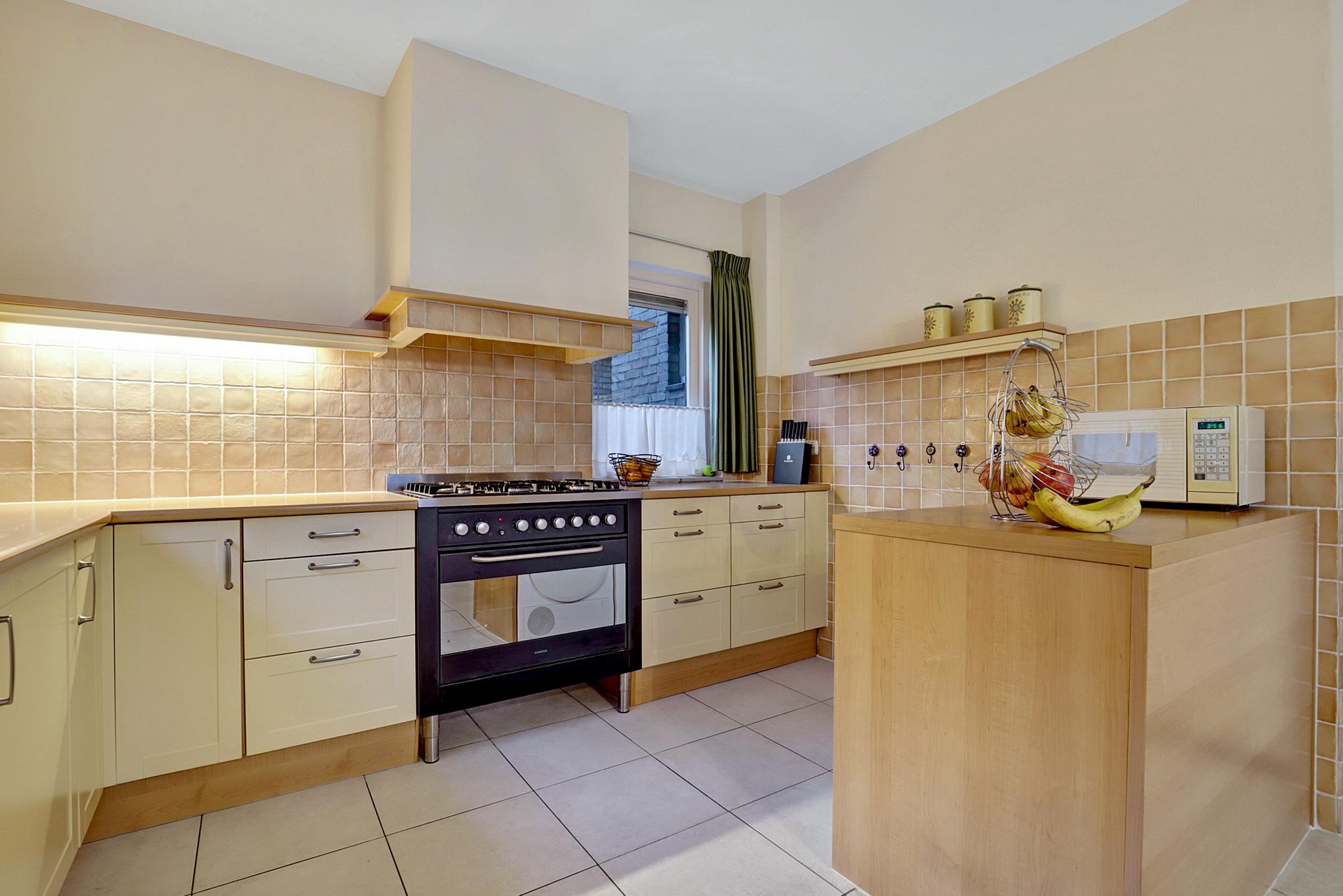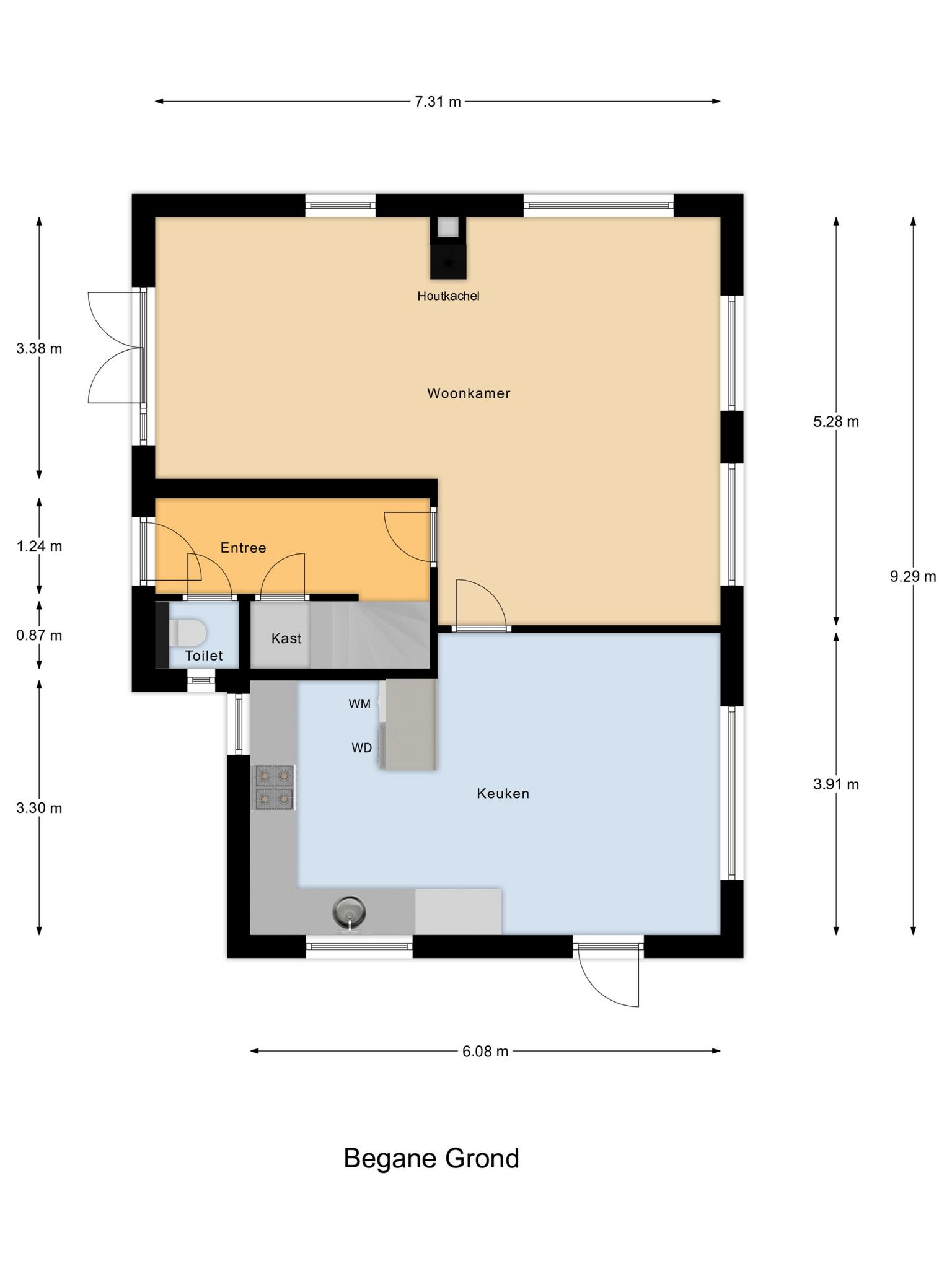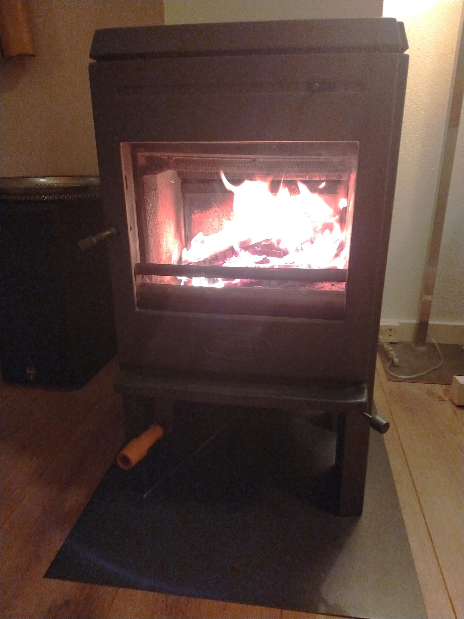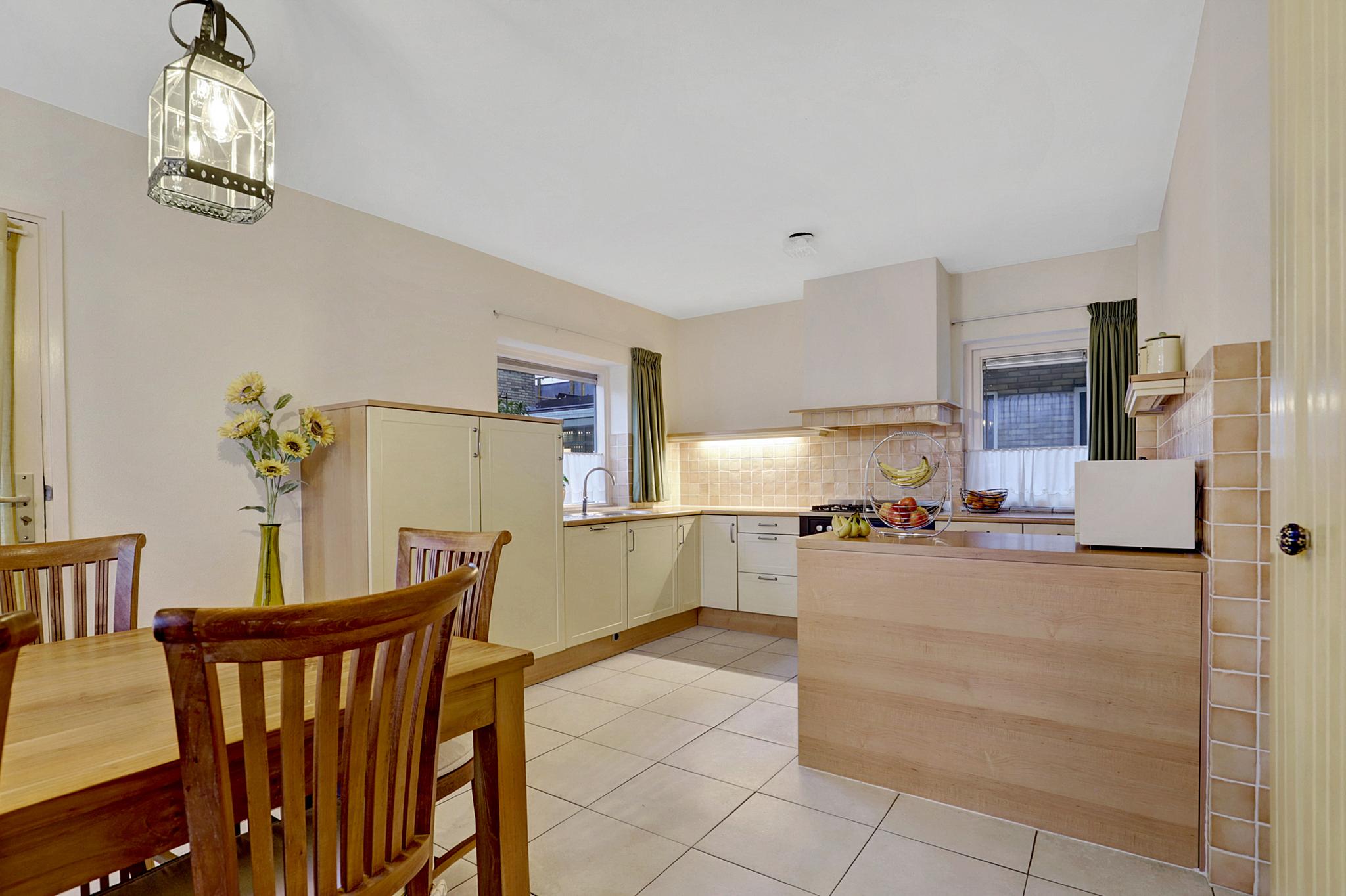 Begane grond: entree in de woonkeuken met vaste kast en een uitgebreide keukeninrichting inclusief diverse inbouwapparatuur en een wasmachine-aansluiting (netjes weggewerkt in een keukenkast). De L-vormige woonkamer heeft terrasdeuren naar de achtertuin en is voorzien van een houtkachel en een airco-unit. Door de grote raampartijen is dit een lichte kamer.