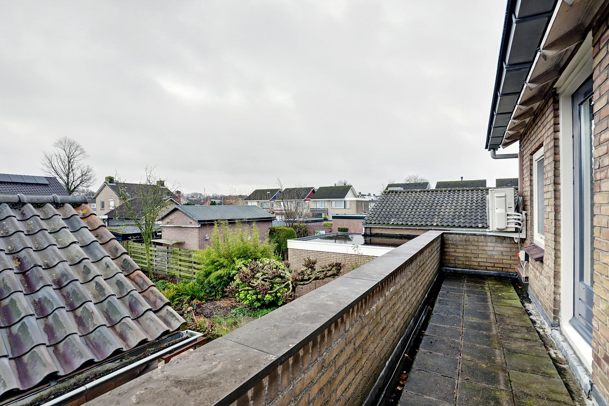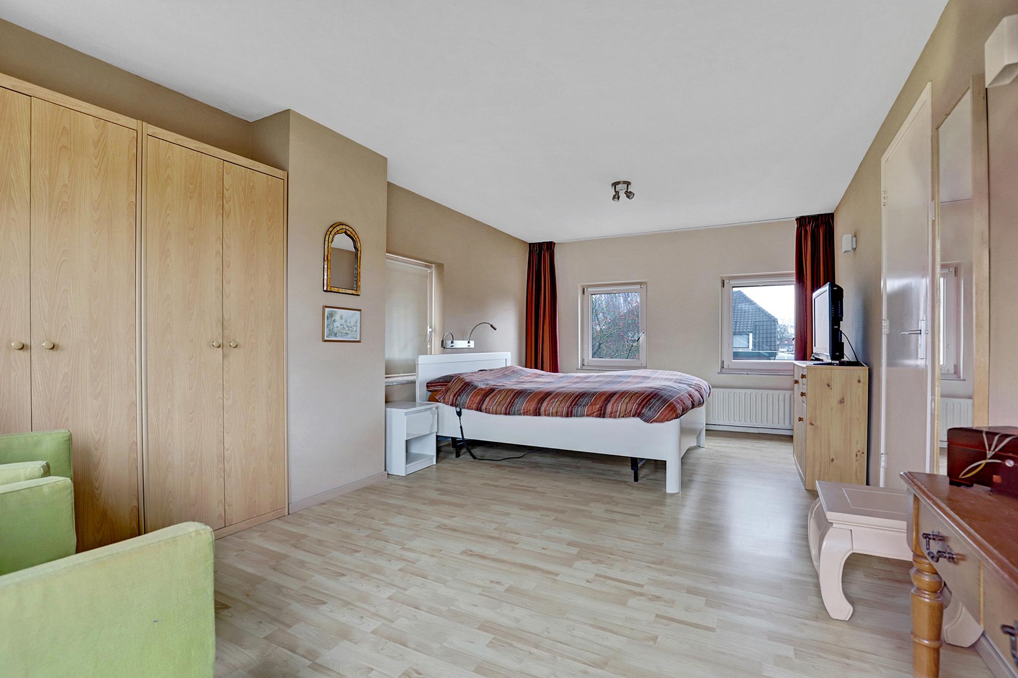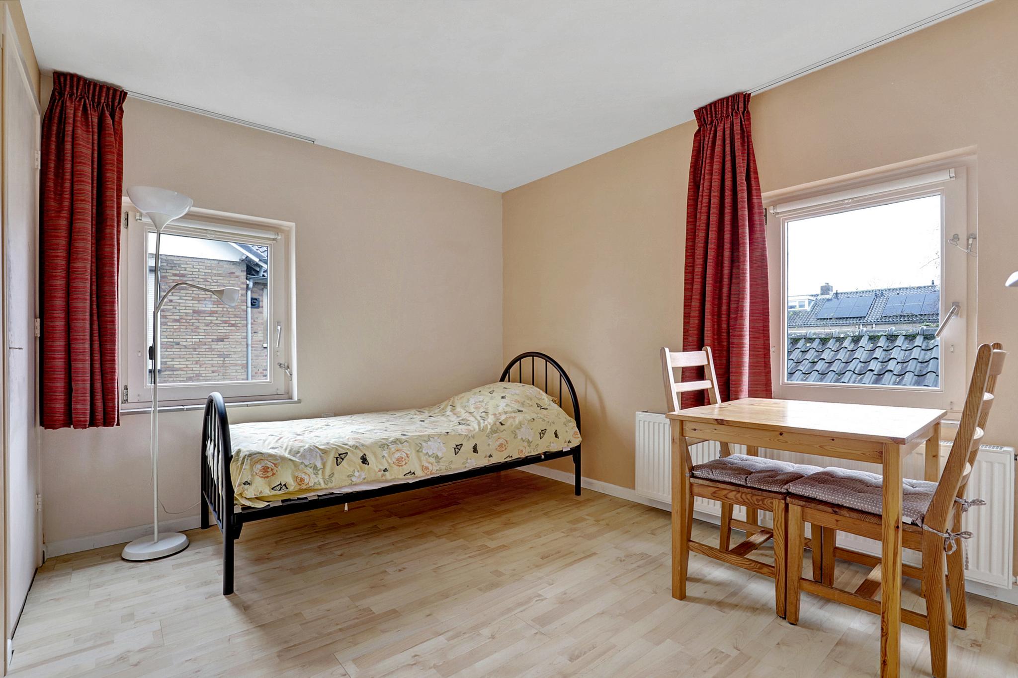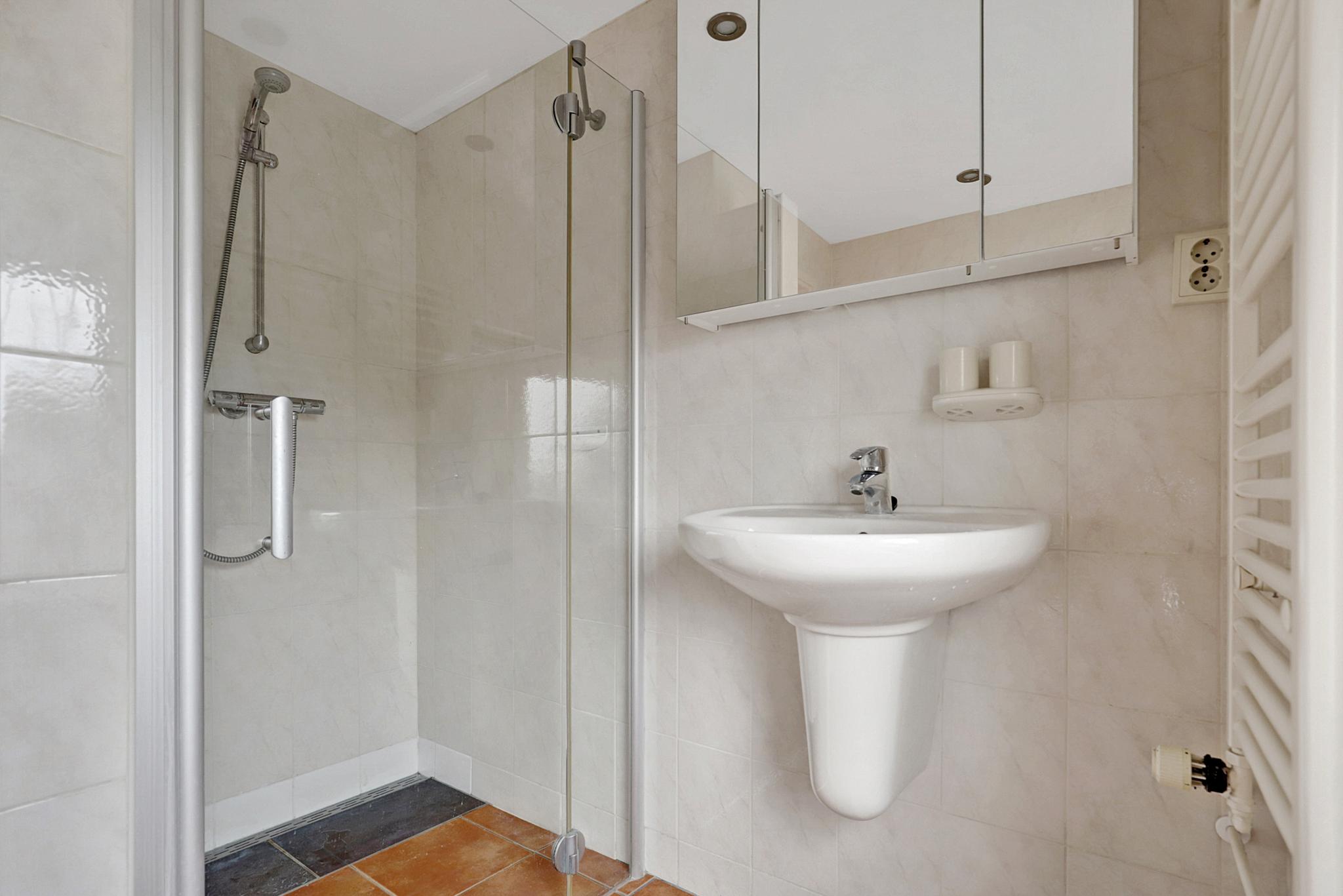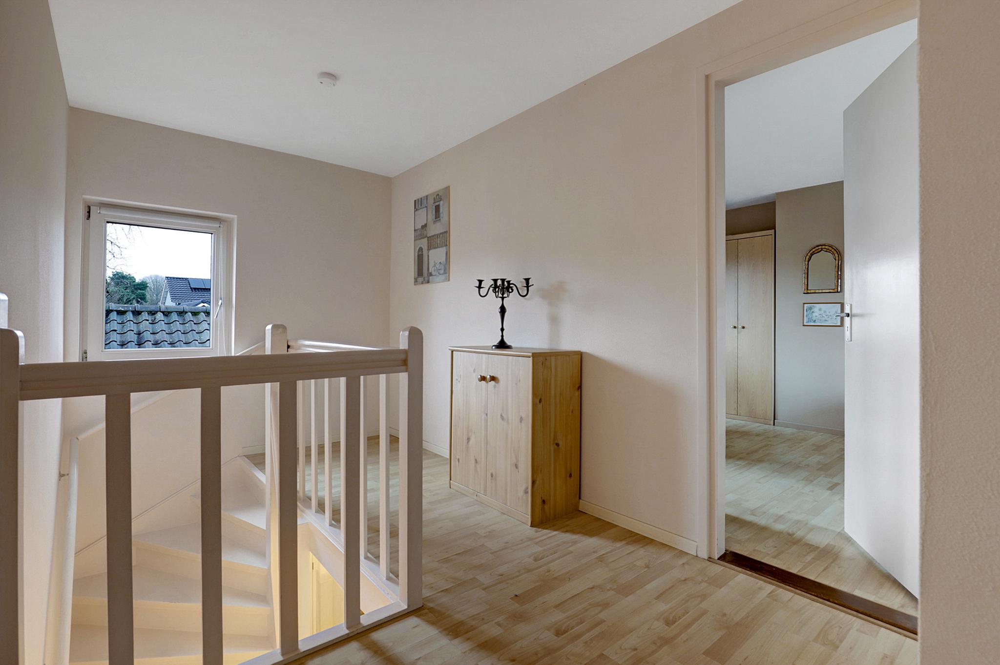 Eerste verdieping: overloop met luik naar de vliering. De badkamer is voorzien van een toilet, wastafel en douche. Verder zijn er drie slaapkamers; één kamer is voorzien van een vaste kast, terwijl de grootste kamer toegang biedt tot een balkon aan de achterzijde van de woning. Deze kamer is voorzien van een airco en is ontstaan uit het samenvoegen van twee kamers; het is goed mogelijk de originele indeling weer terug te brengen zodat er weer vier slaapkamers zijn.